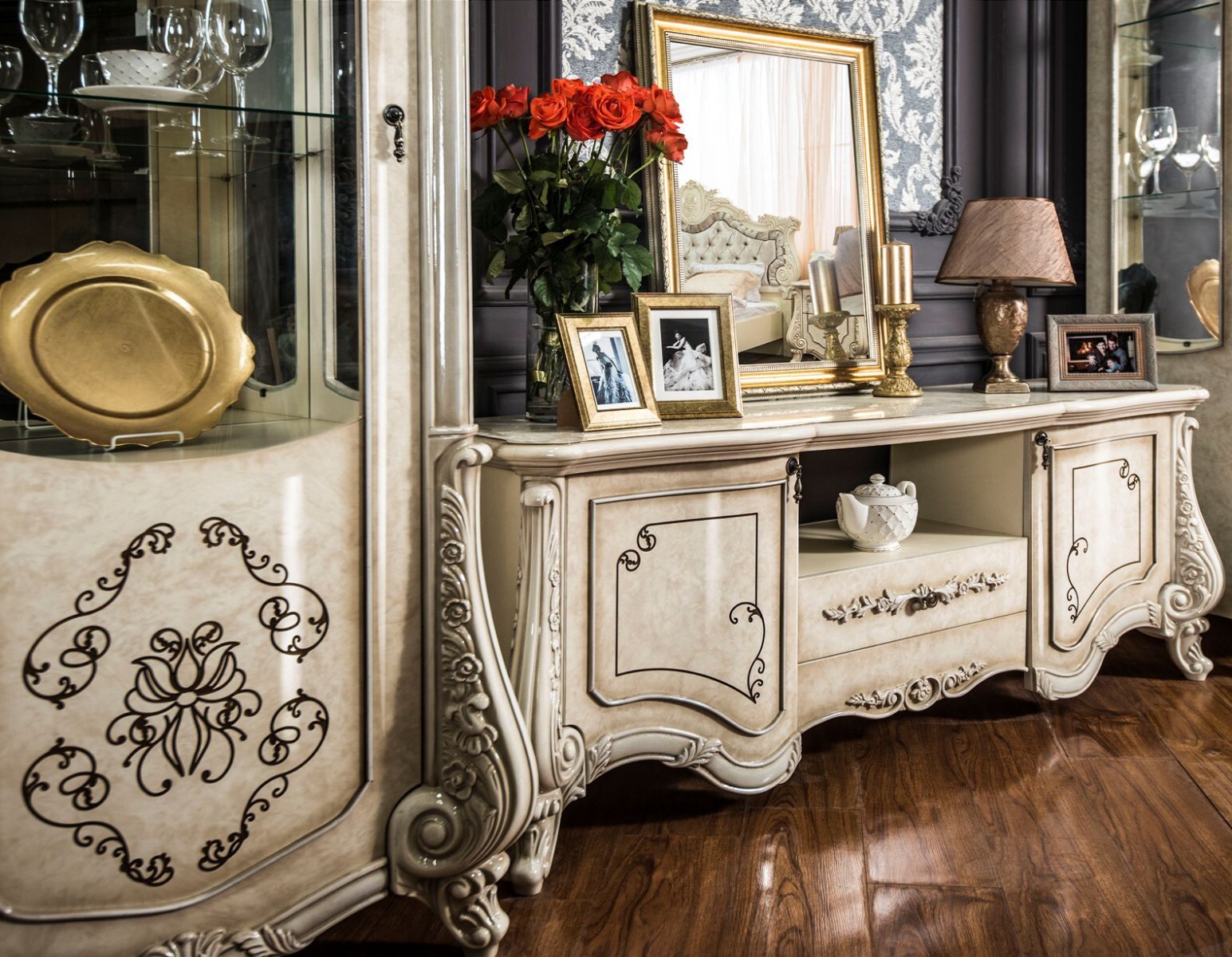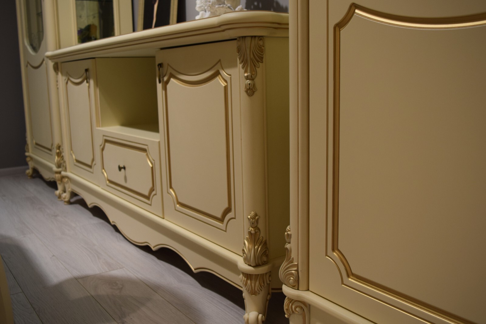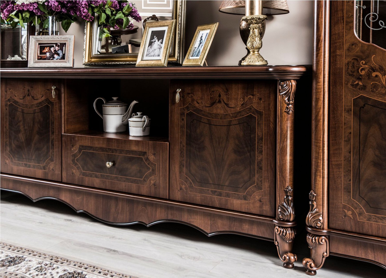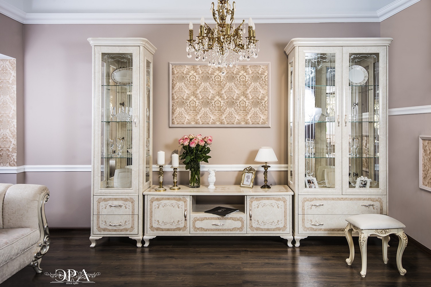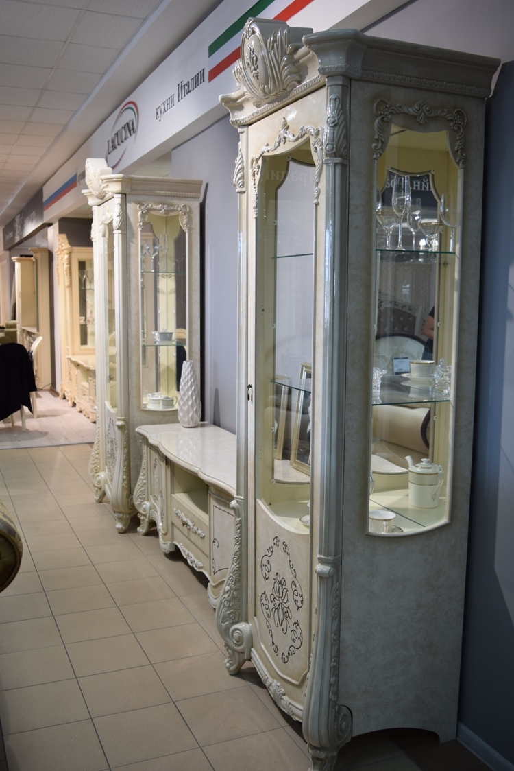Особое внимание уделено деталям: - Панорамные витрины с бесшумными ящиками и шёлковым шнуром, фиксирующим расписное стекло - Функциональные модули, которые легко комбинируются в гостиную, столовую или спальню - Лёгкие ТВ-тумбы и уютная мягкая мебель для завершения образа
