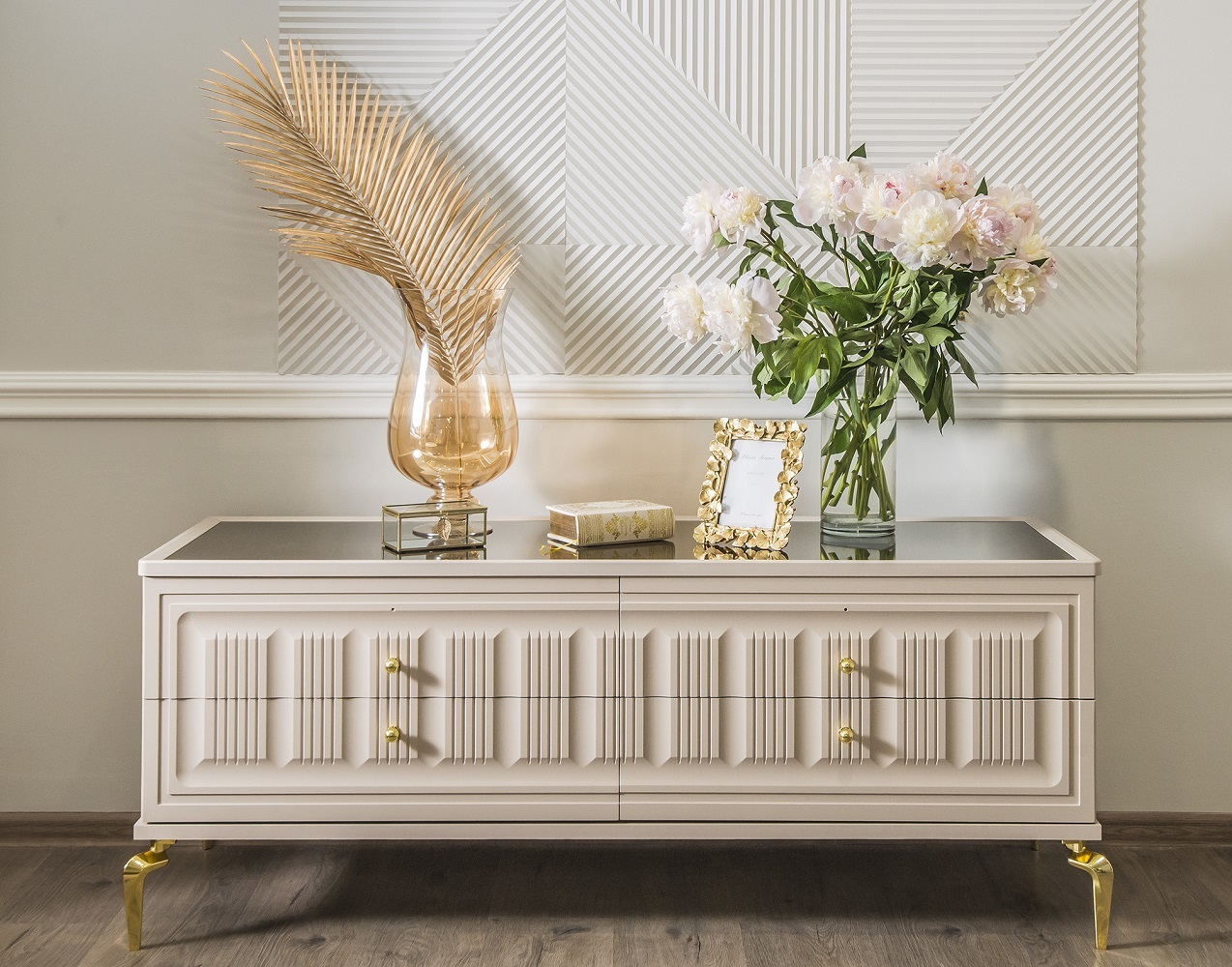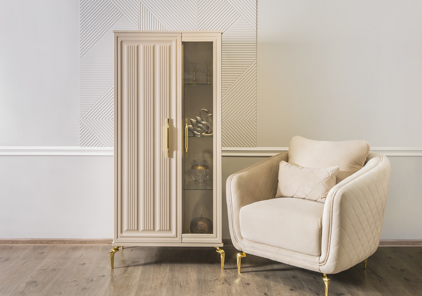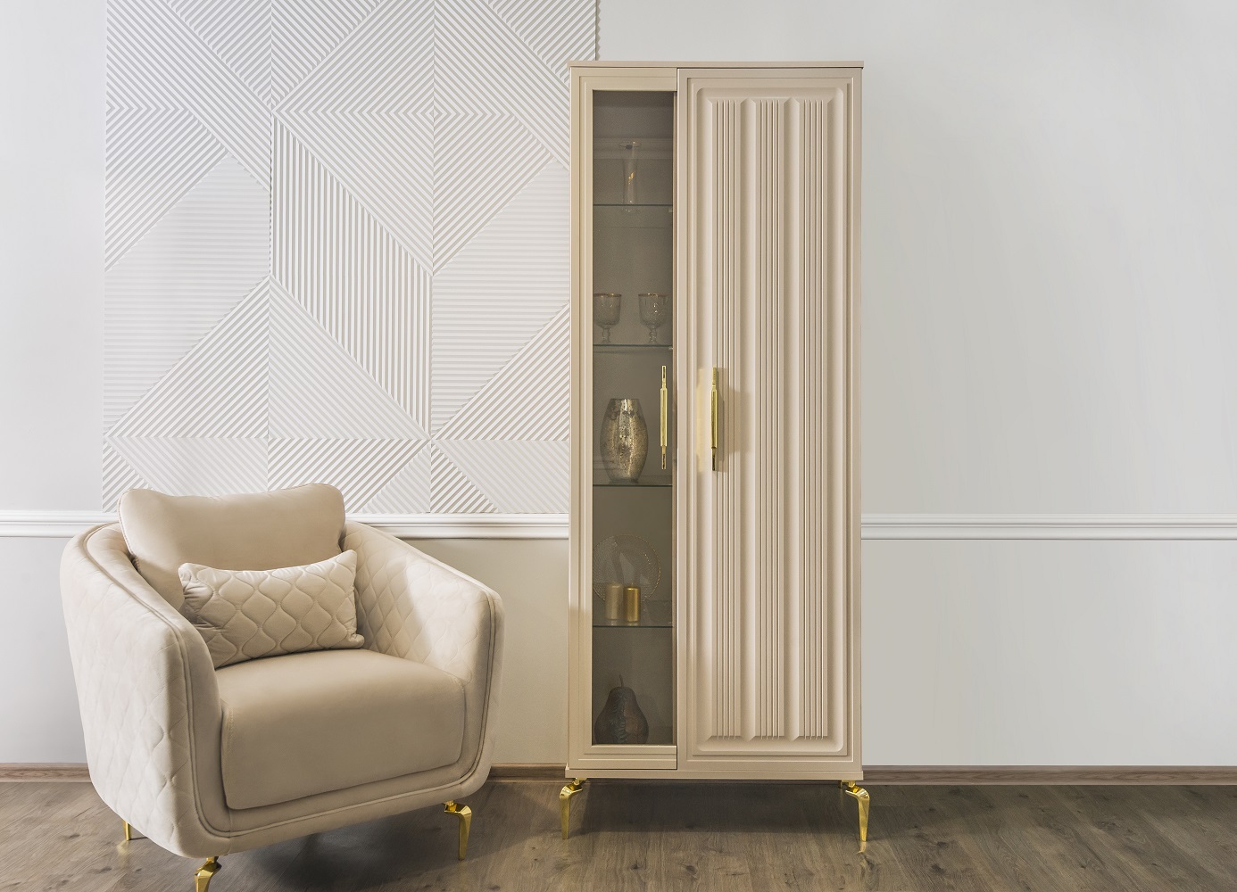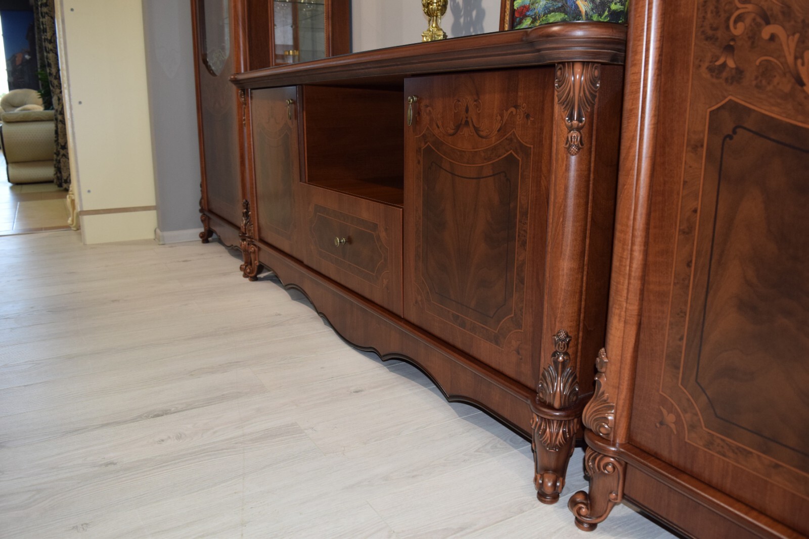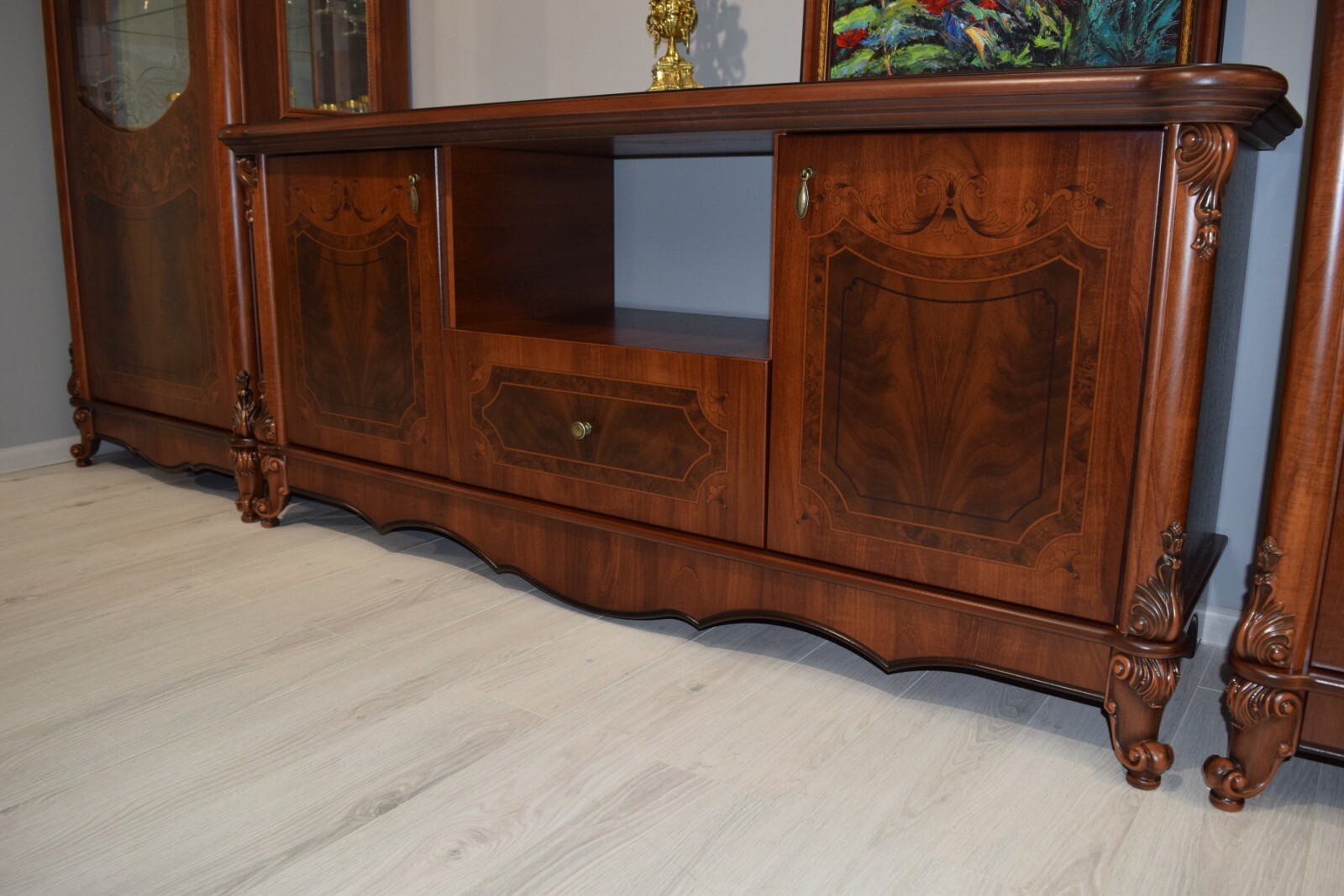 Особое внимание уделено деталям: - Панорамные витрины с бесшумными ящиками и шёлковым шнуром, фиксирующим расписное стекло - Функциональные модули, которые легко комбинируются в гостиную, столовую или спальню - Лёгкие ТВ-тумбы и уютная мягкая мебель для завершения образа