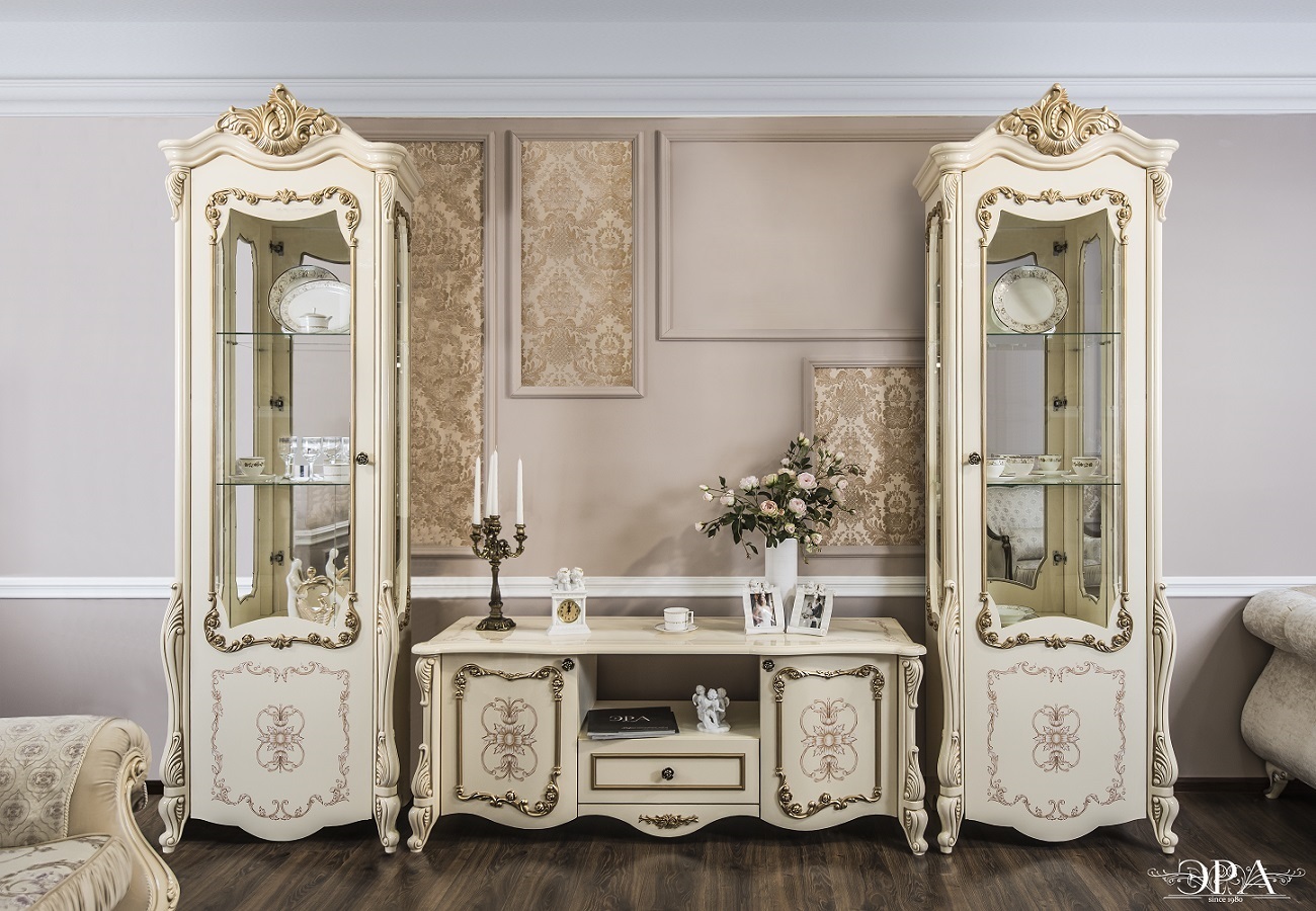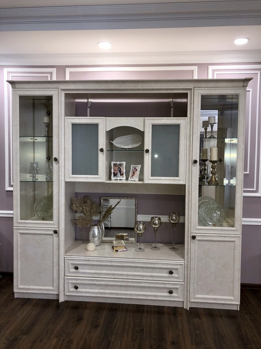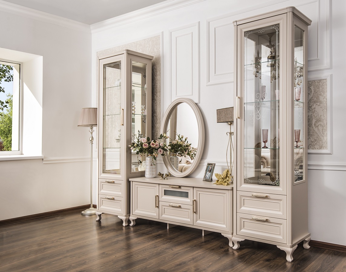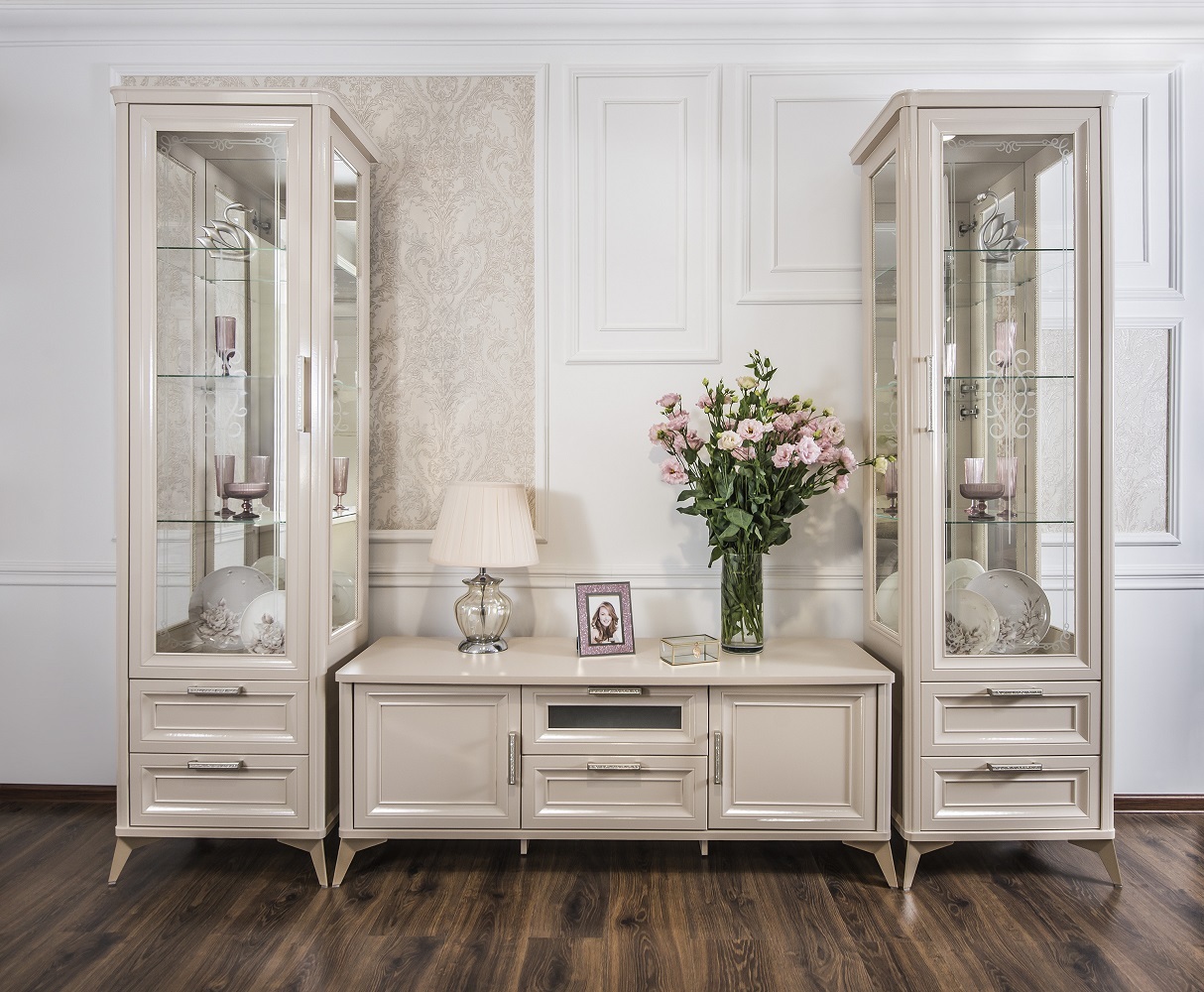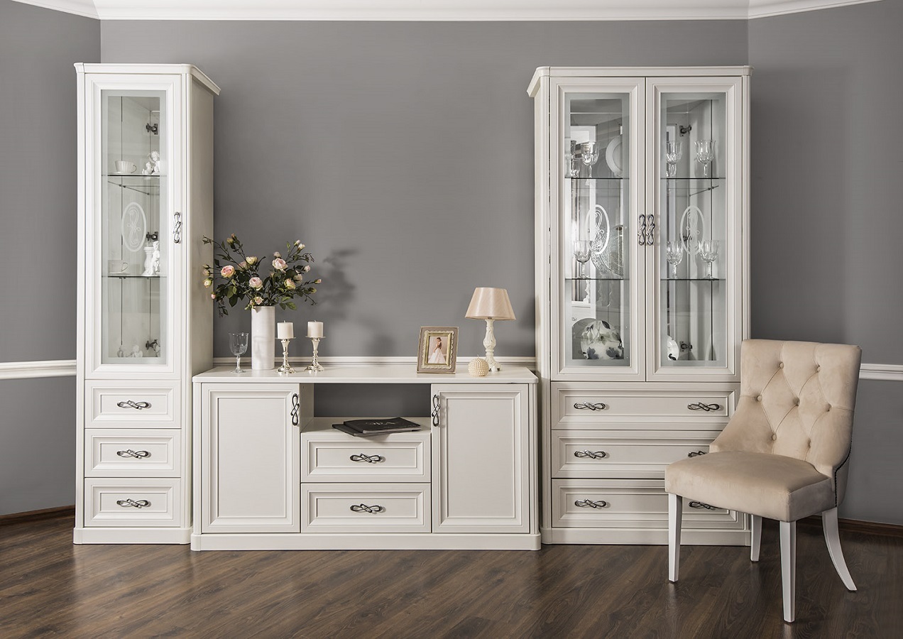 Двухдверные витрины (высокая 2075 мм и низкая 1700 мм) с изысканным остеклением создают эффект воздушности и идеально подходят для демонстрации фарфоровых коллекций. Практичная тумба под ТВ (1470 мм) с вместительными отделениями гармонично дополняет ансамбль.