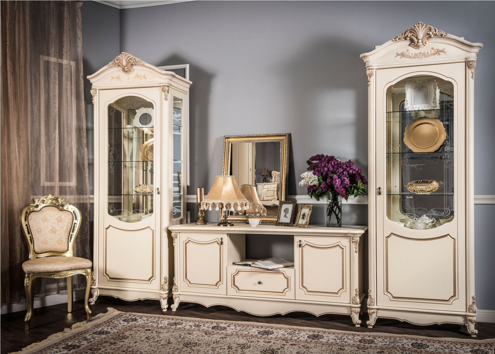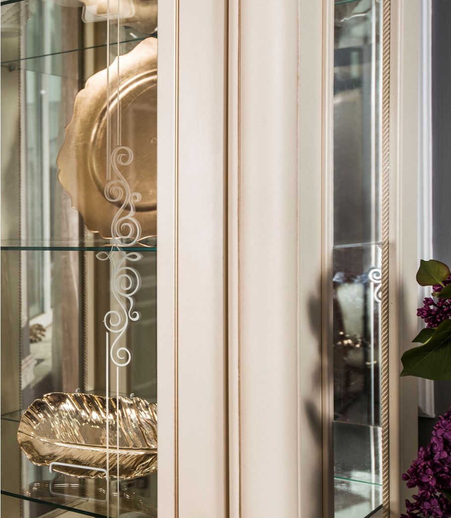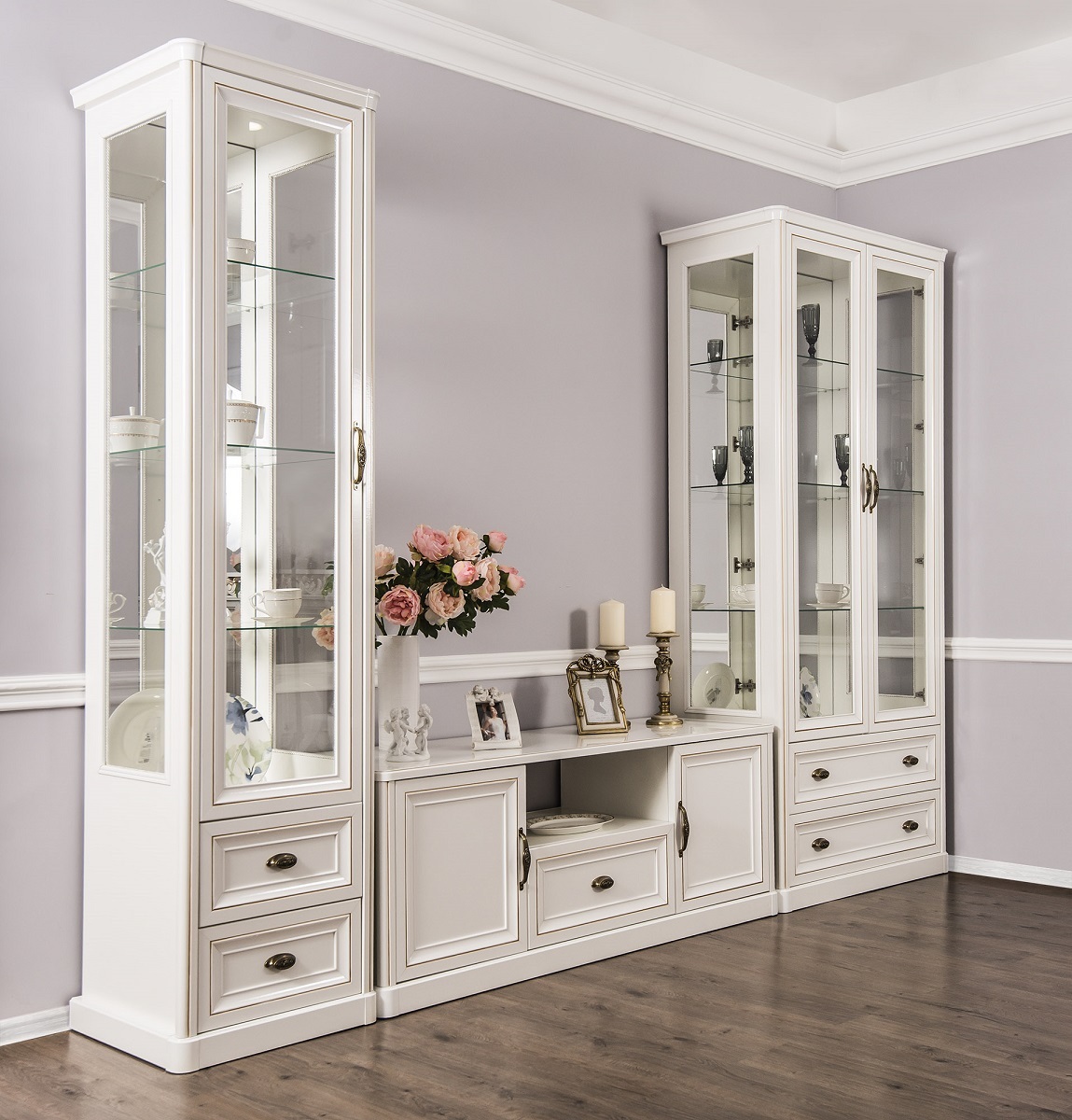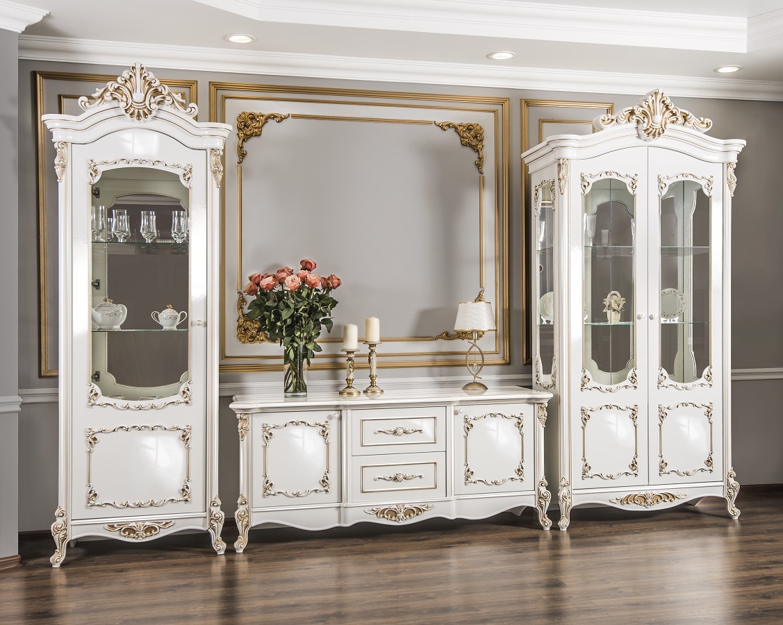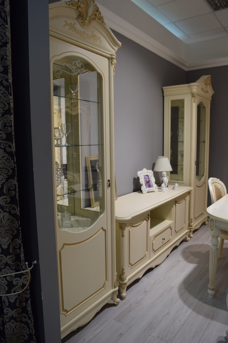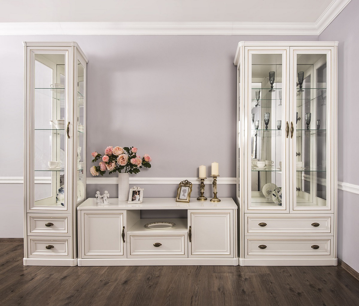 Двухдверные витрины (высокая 2075 мм и низкая 1700 мм) с изысканным остеклением создают эффект воздушности и идеально подходят для демонстрации фарфоровых коллекций. Практичная тумба под ТВ (1470 мм) с вместительными отделениями гармонично дополняет ансамбль.