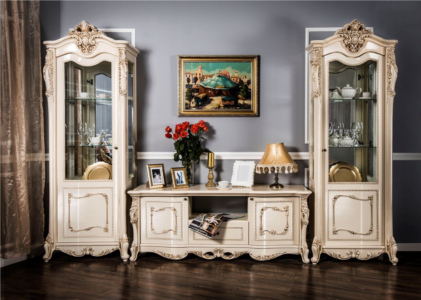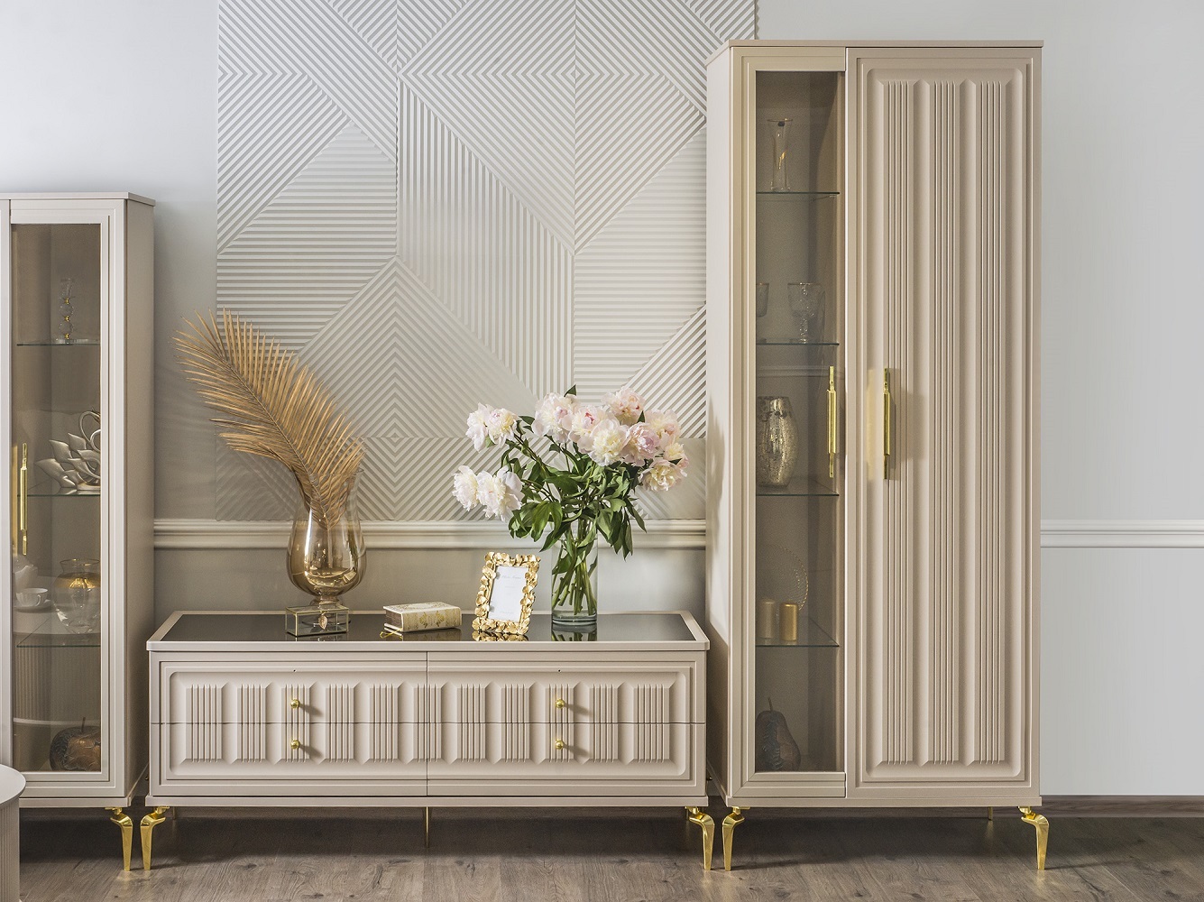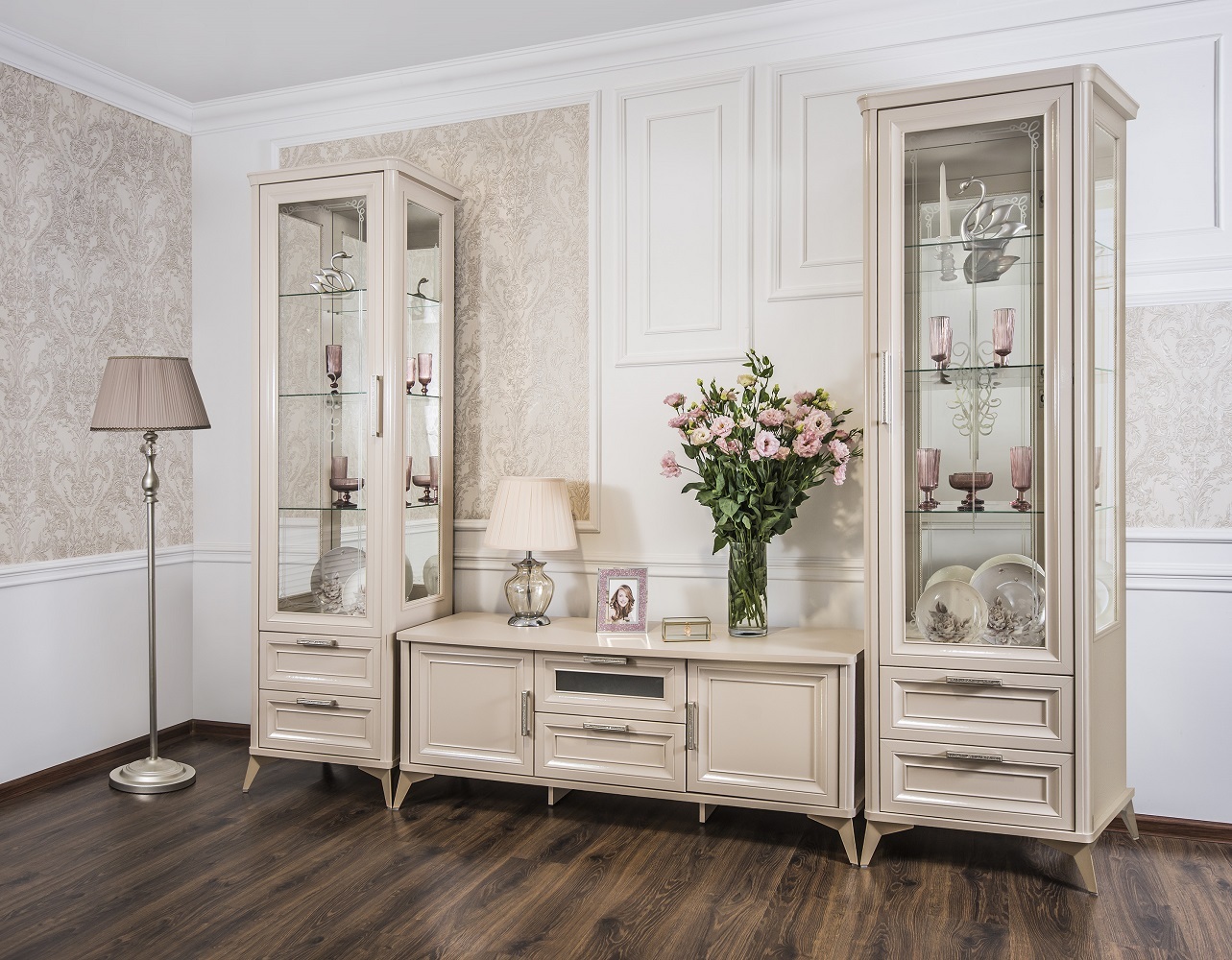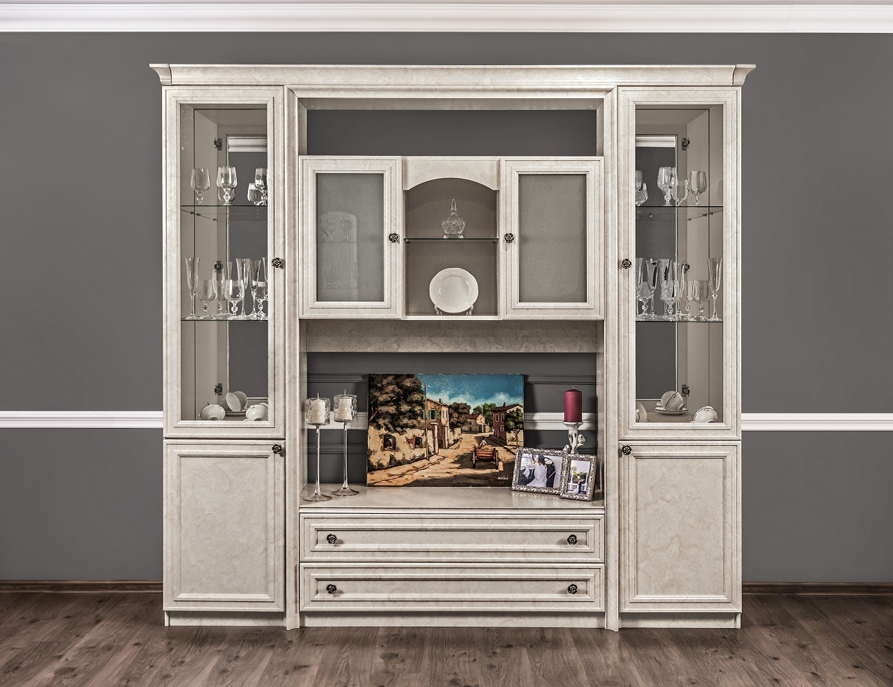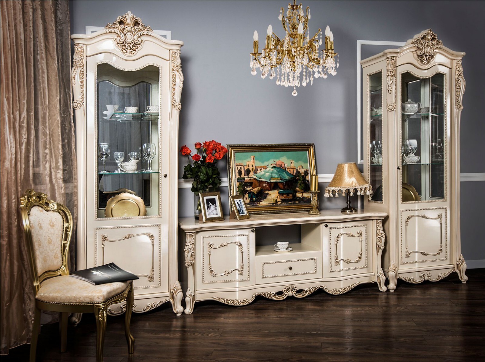 Двухдверные витрины (высокая 2075 мм и низкая 1700 мм) с изысканным остеклением создают эффект воздушности и идеально подходят для демонстрации фарфоровых коллекций. Практичная тумба под ТВ (1470 мм) с вместительными отделениями гармонично дополняет ансамбль.