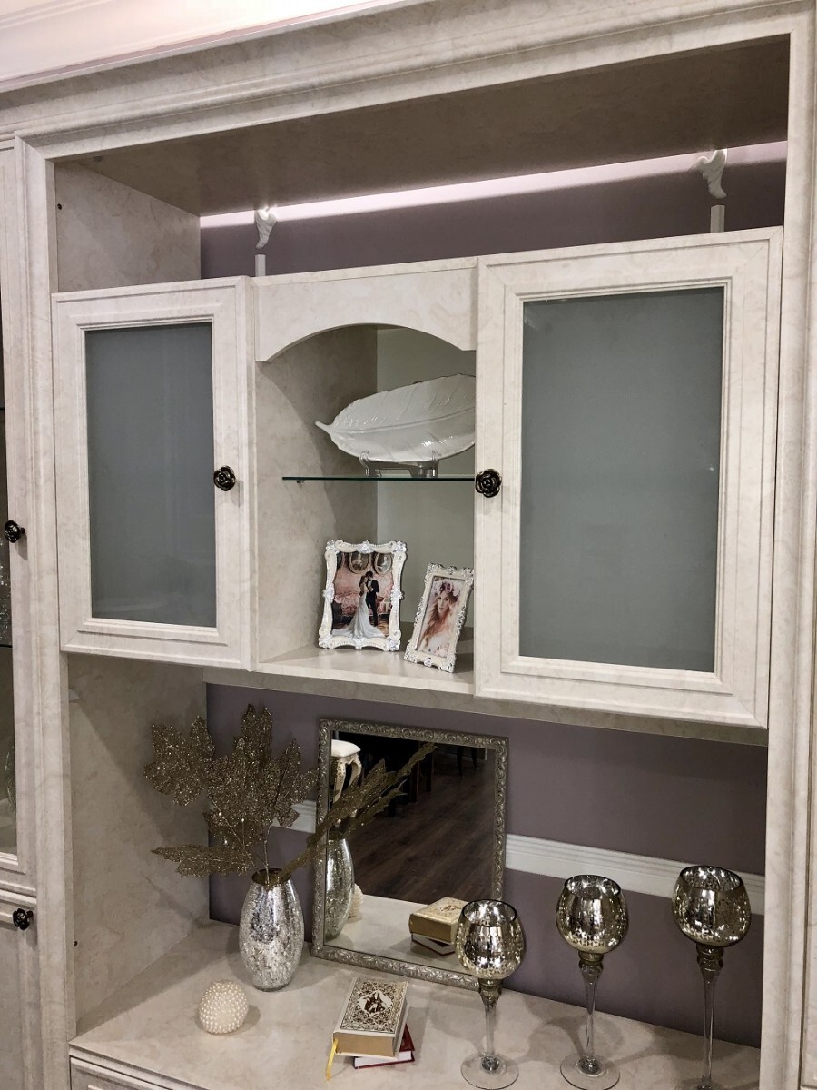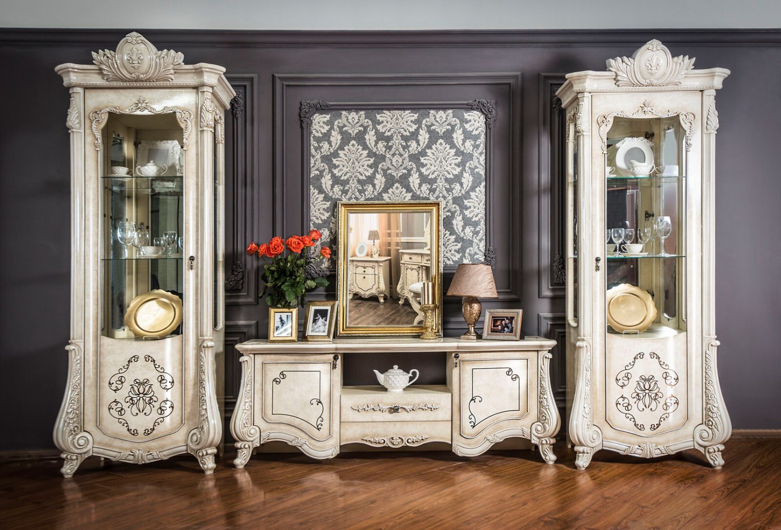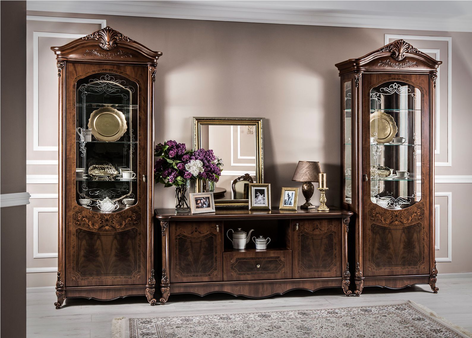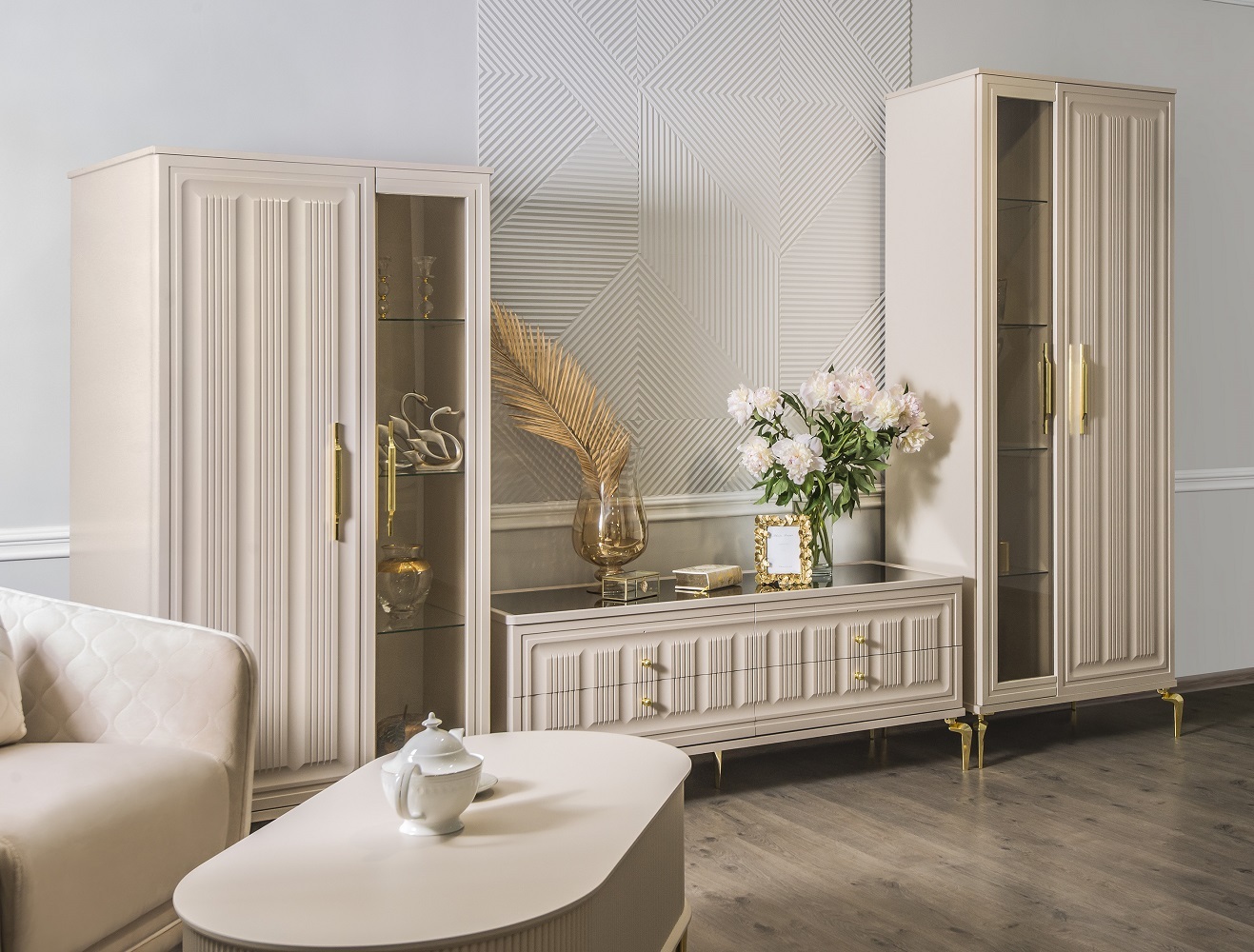 Двухдверные витрины (высокая 2075 мм и низкая 1700 мм) с изысканным остеклением создают эффект воздушности и идеально подходят для демонстрации фарфоровых коллекций. Практичная тумба под ТВ (1470 мм) с вместительными отделениями гармонично дополняет ансамбль.