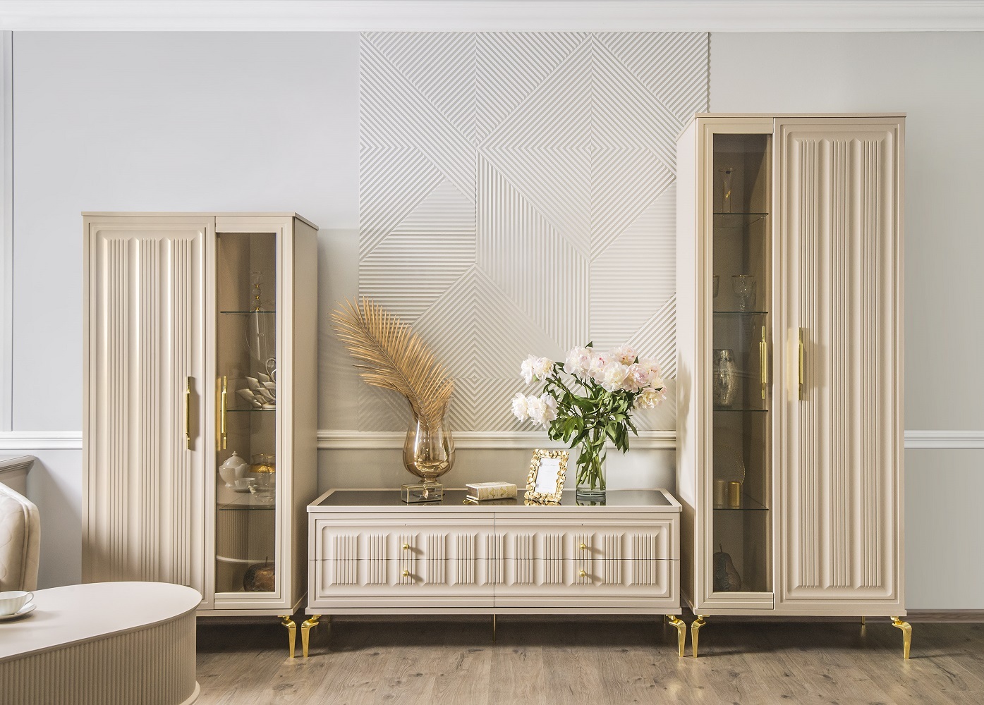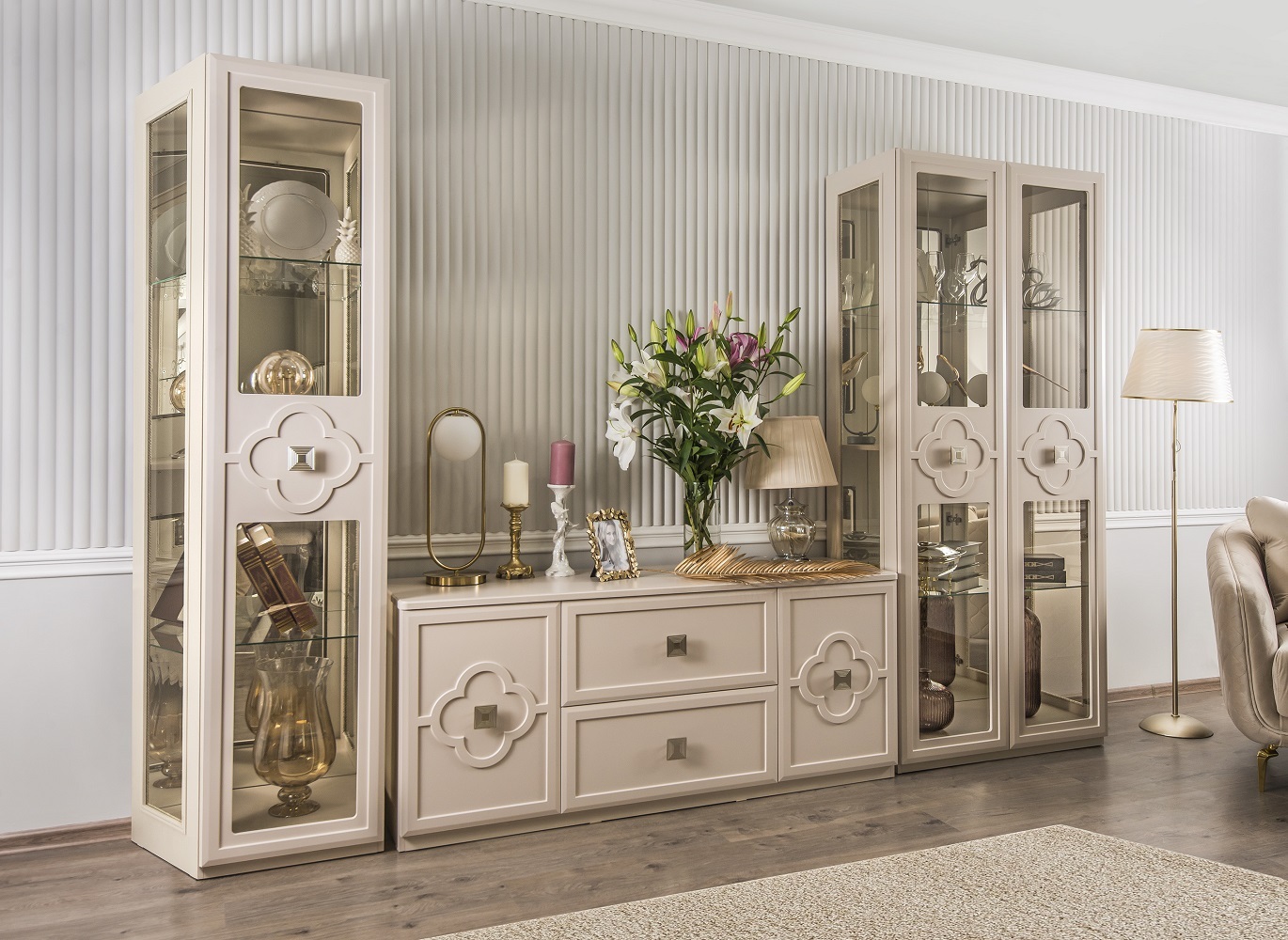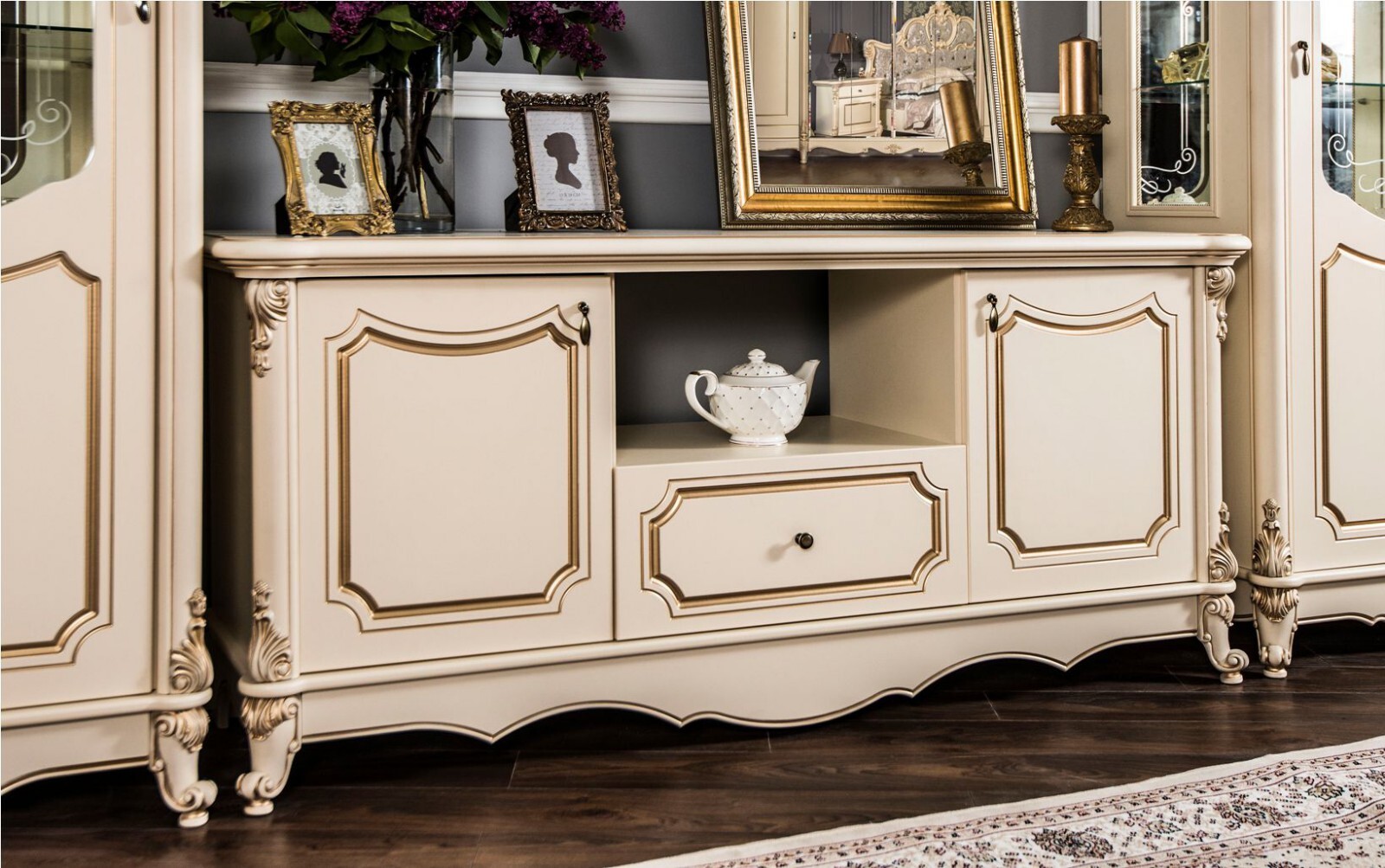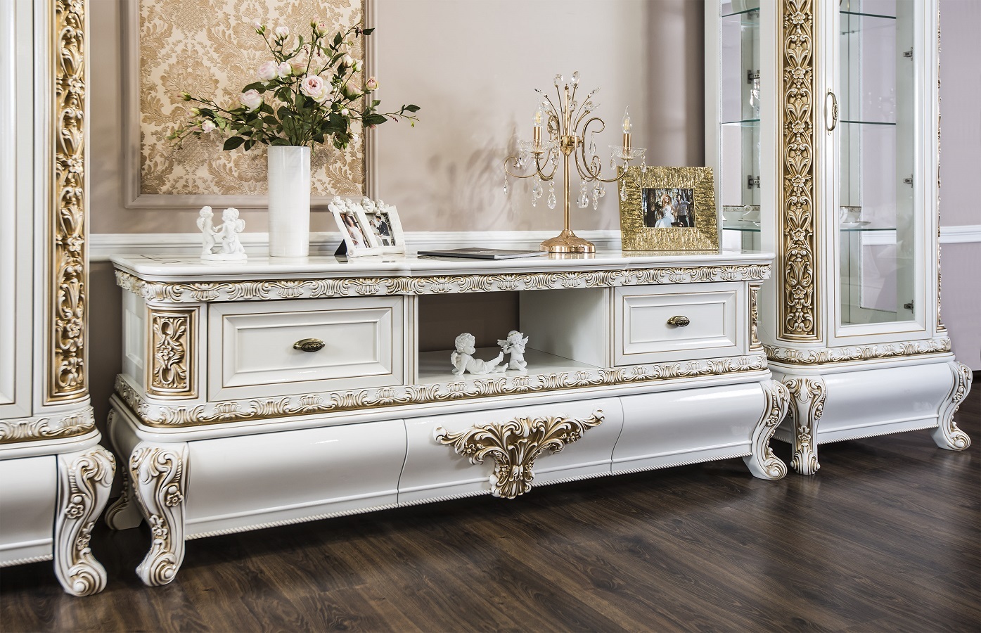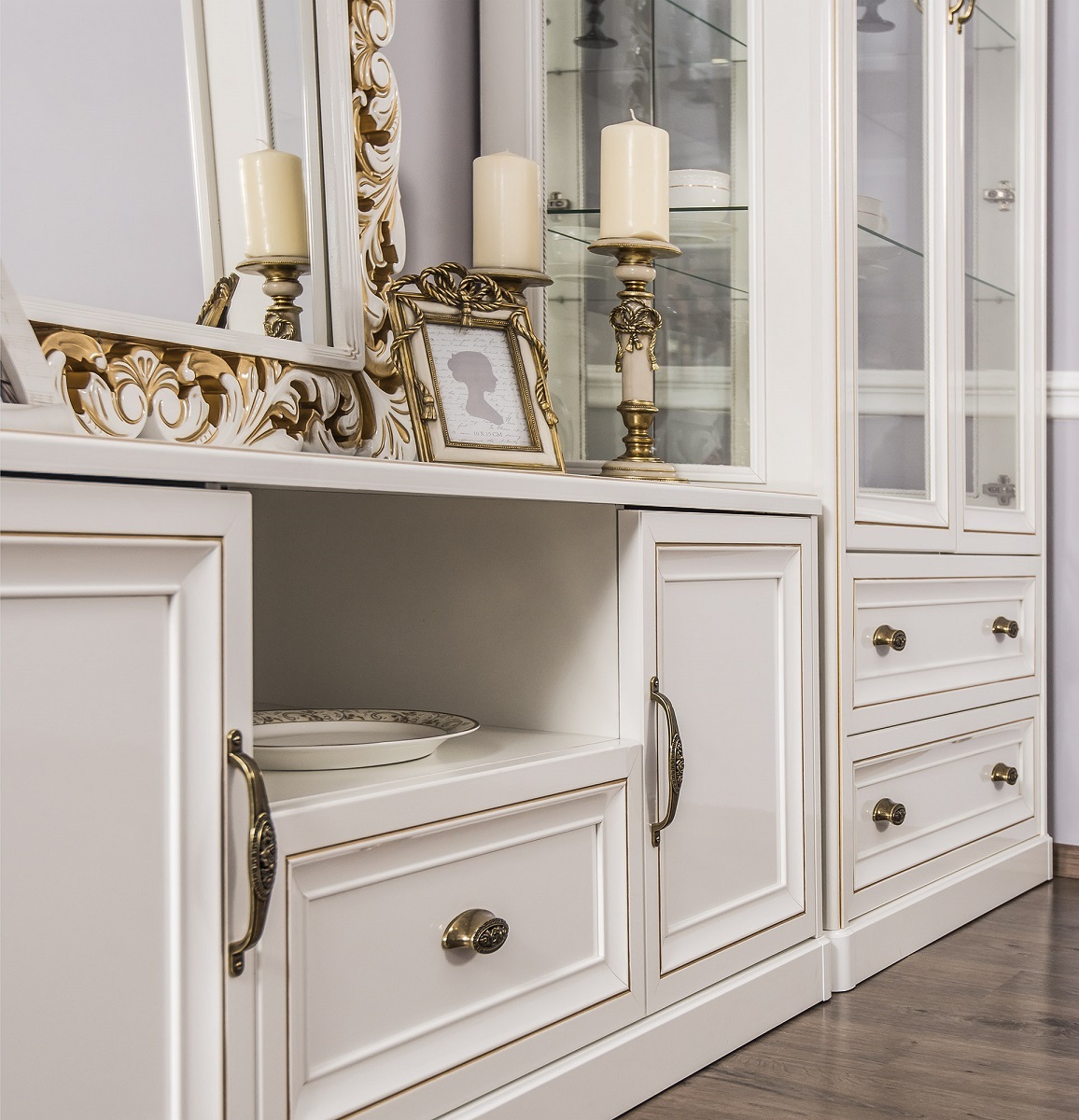Двухдверные витрины (высокая 2075 мм и низкая 1700 мм) с изысканным остеклением создают эффект воздушности и идеально подходят для демонстрации фарфоровых коллекций. Практичная тумба под ТВ (1470 мм) с вместительными отделениями гармонично дополняет ансамбль.