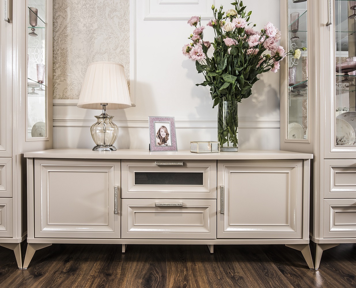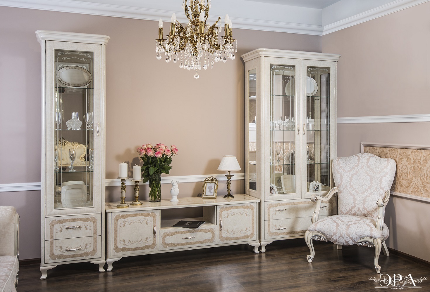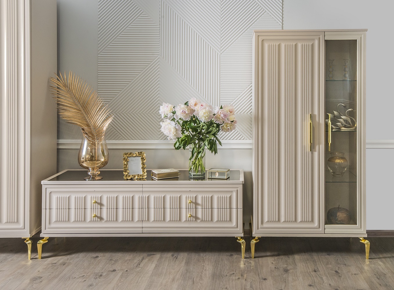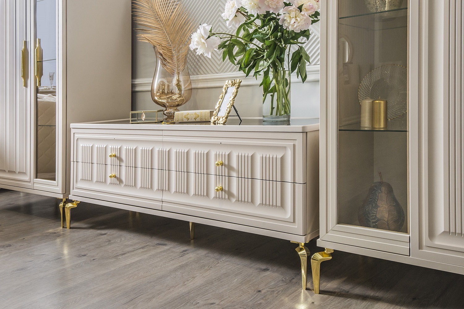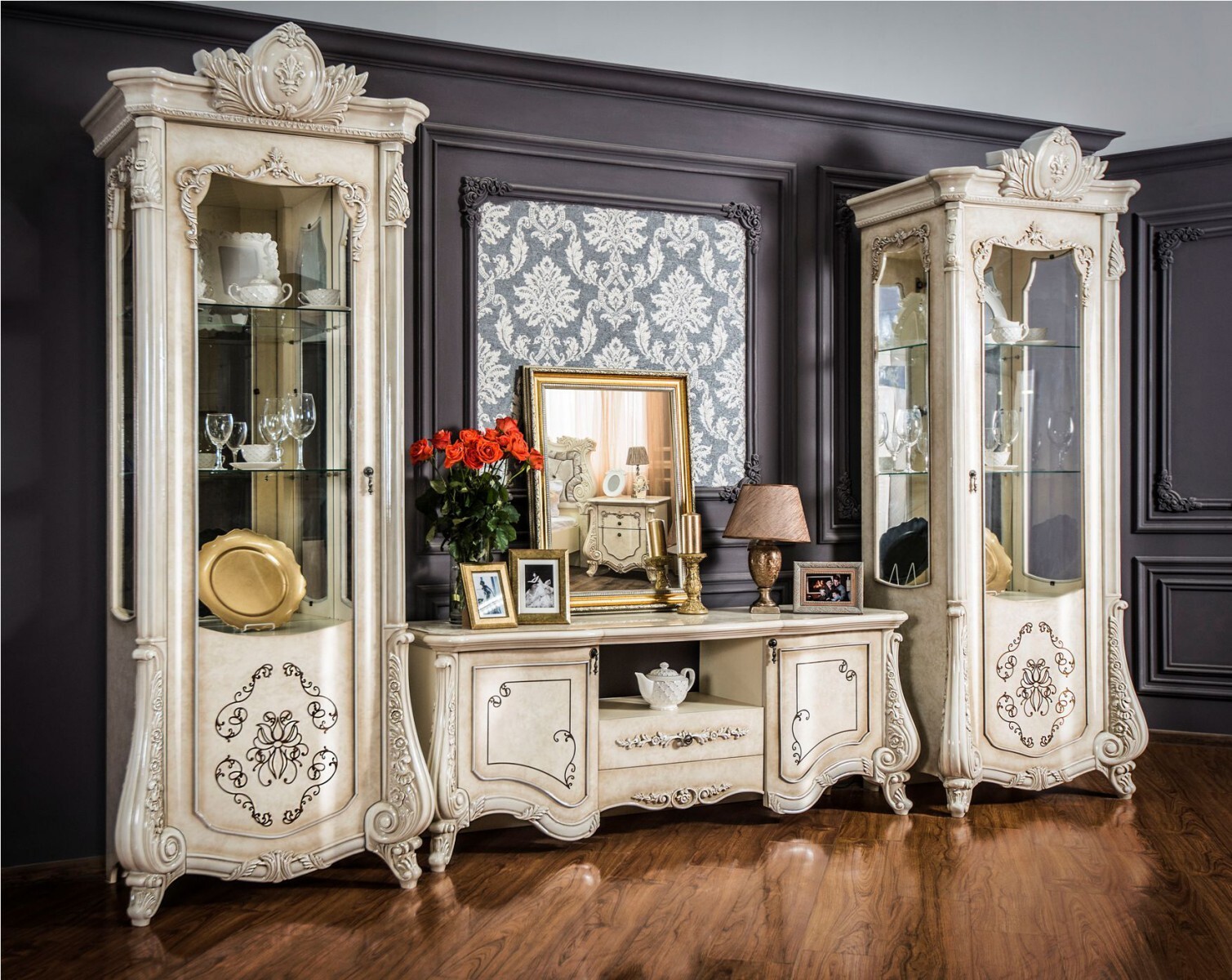 Двухдверные витрины (высокая 2075 мм и низкая 1700 мм) с изысканным остеклением создают эффект воздушности и идеально подходят для демонстрации фарфоровых коллекций. Практичная тумба под ТВ (1470 мм) с вместительными отделениями гармонично дополняет ансамбль.
