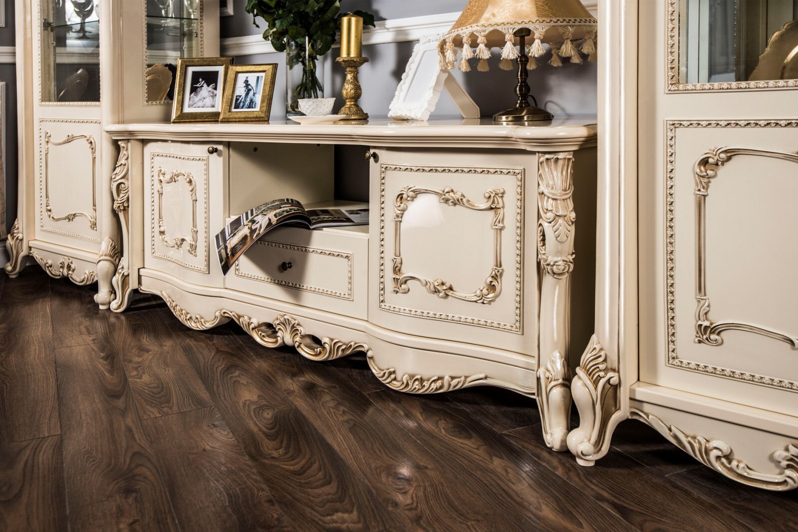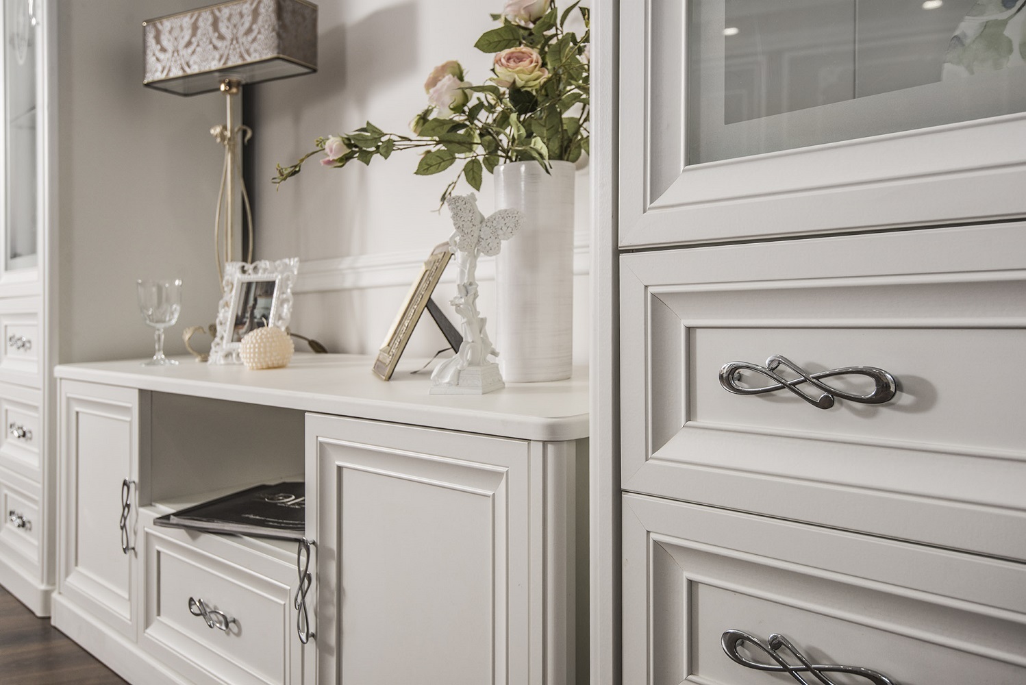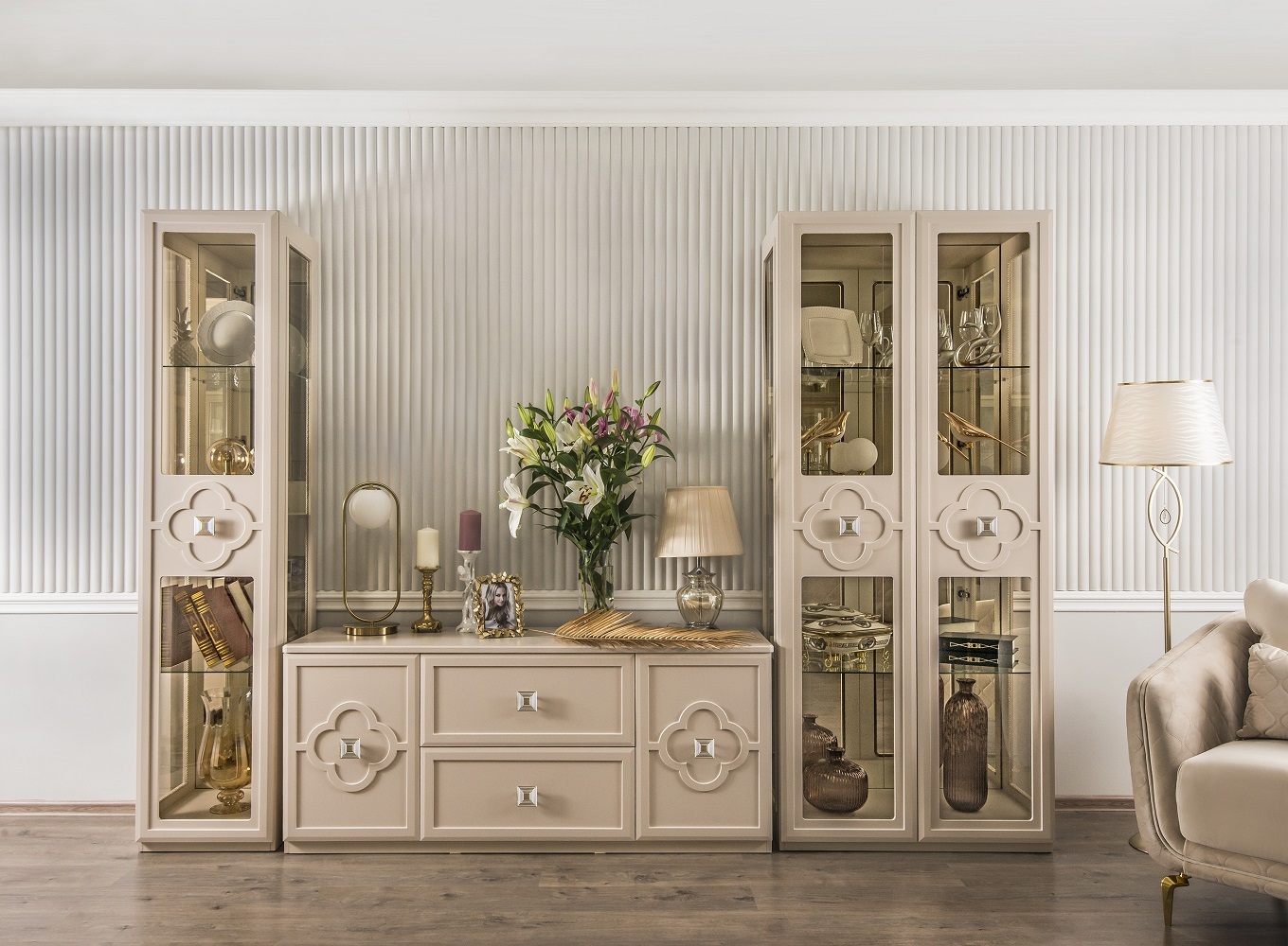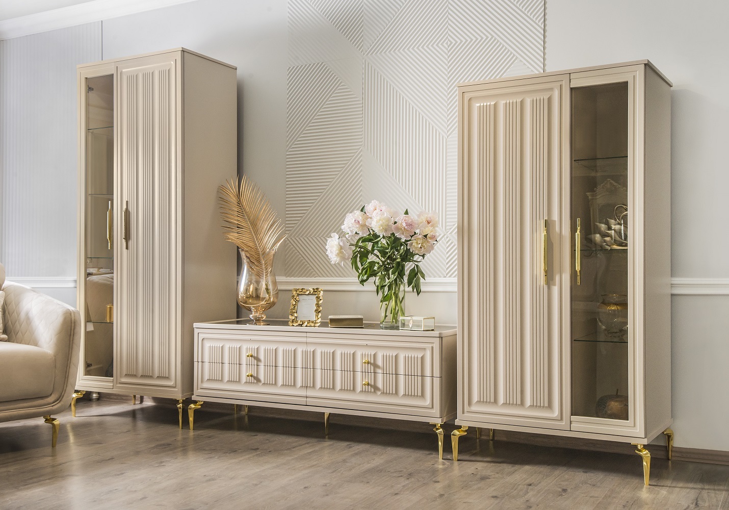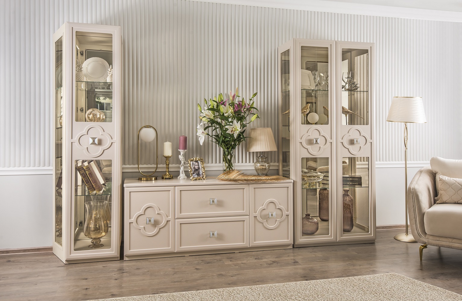 Двухдверные витрины (высокая 2075 мм и низкая 1700 мм) с изысканным остеклением создают эффект воздушности и идеально подходят для демонстрации фарфоровых коллекций. Практичная тумба под ТВ (1470 мм) с вместительными отделениями гармонично дополняет ансамбль.