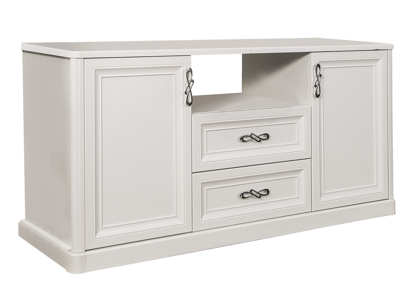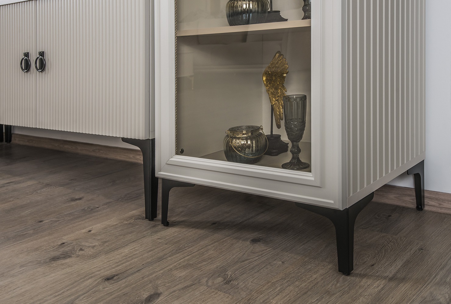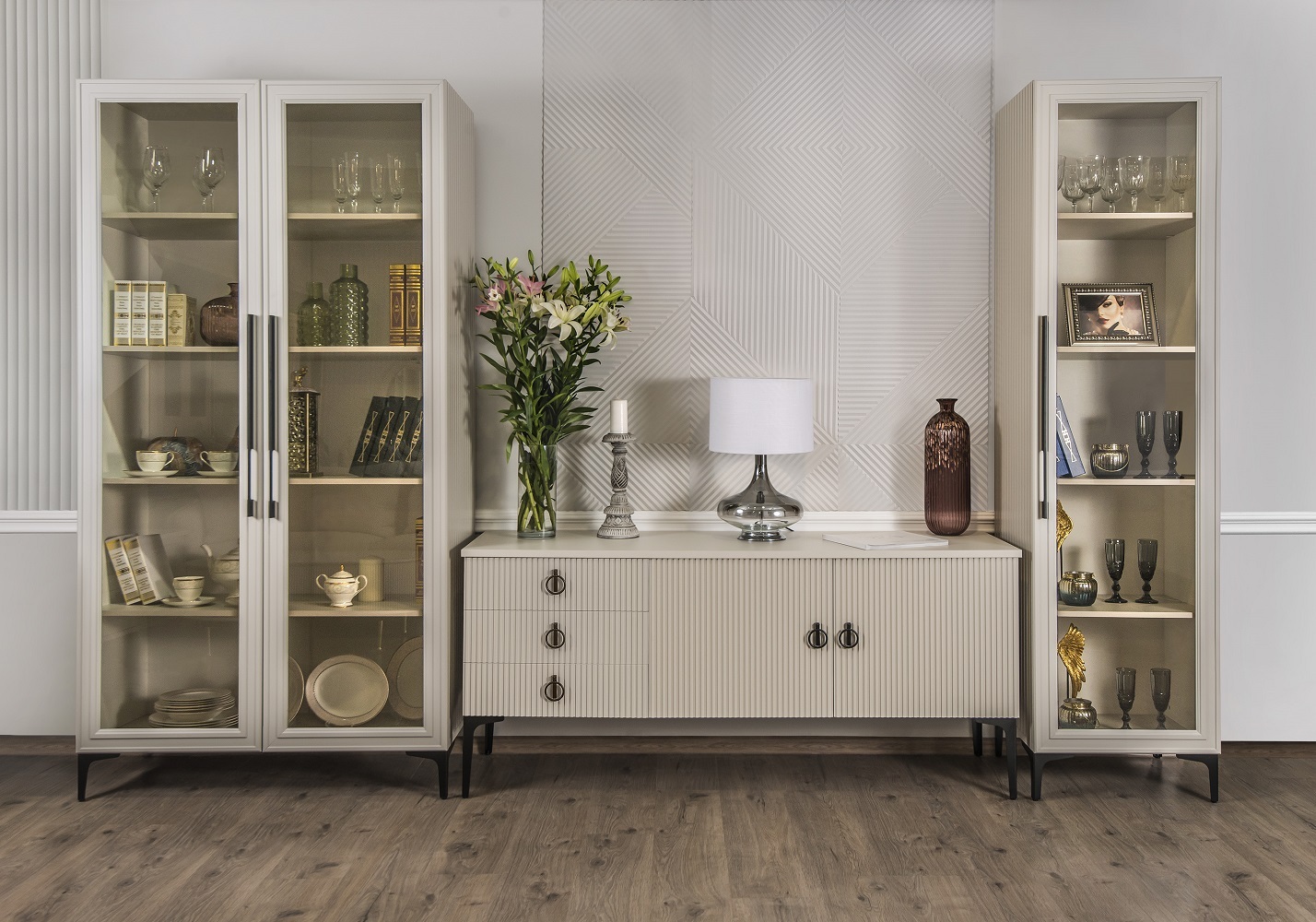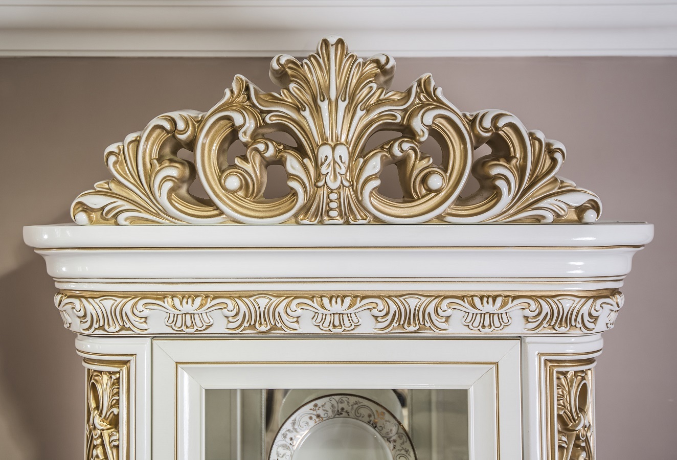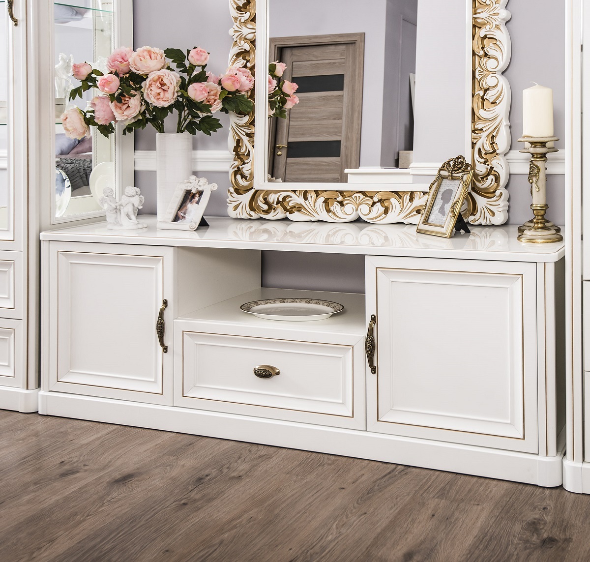 Двухдверные витрины (высокая 2075 мм и низкая 1700 мм) с изысканным остеклением создают эффект воздушности и идеально подходят для демонстрации фарфоровых коллекций. Практичная тумба под ТВ (1470 мм) с вместительными отделениями гармонично дополняет ансамбль.