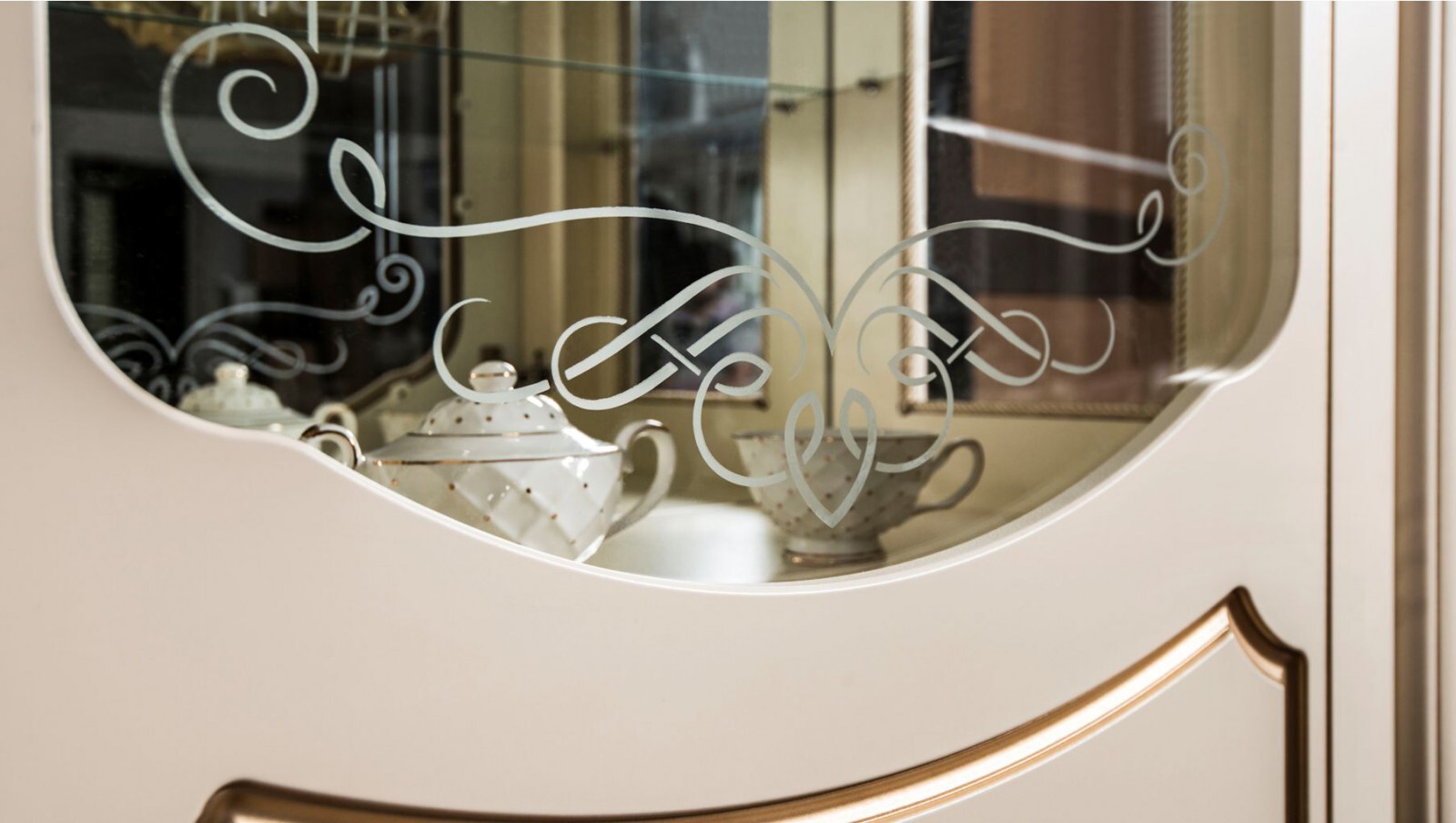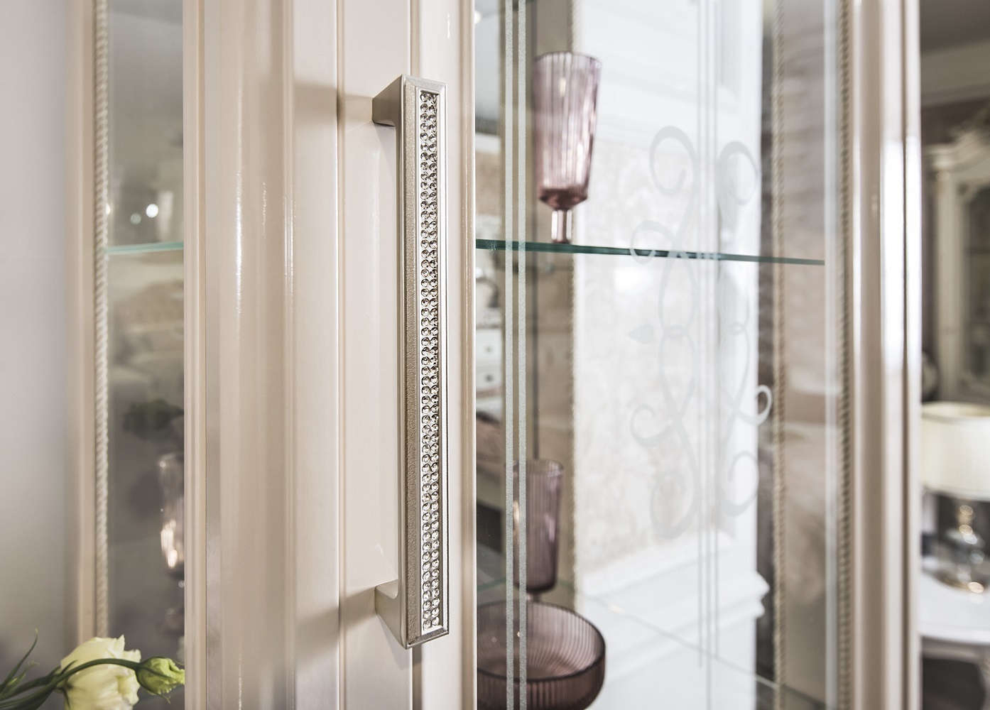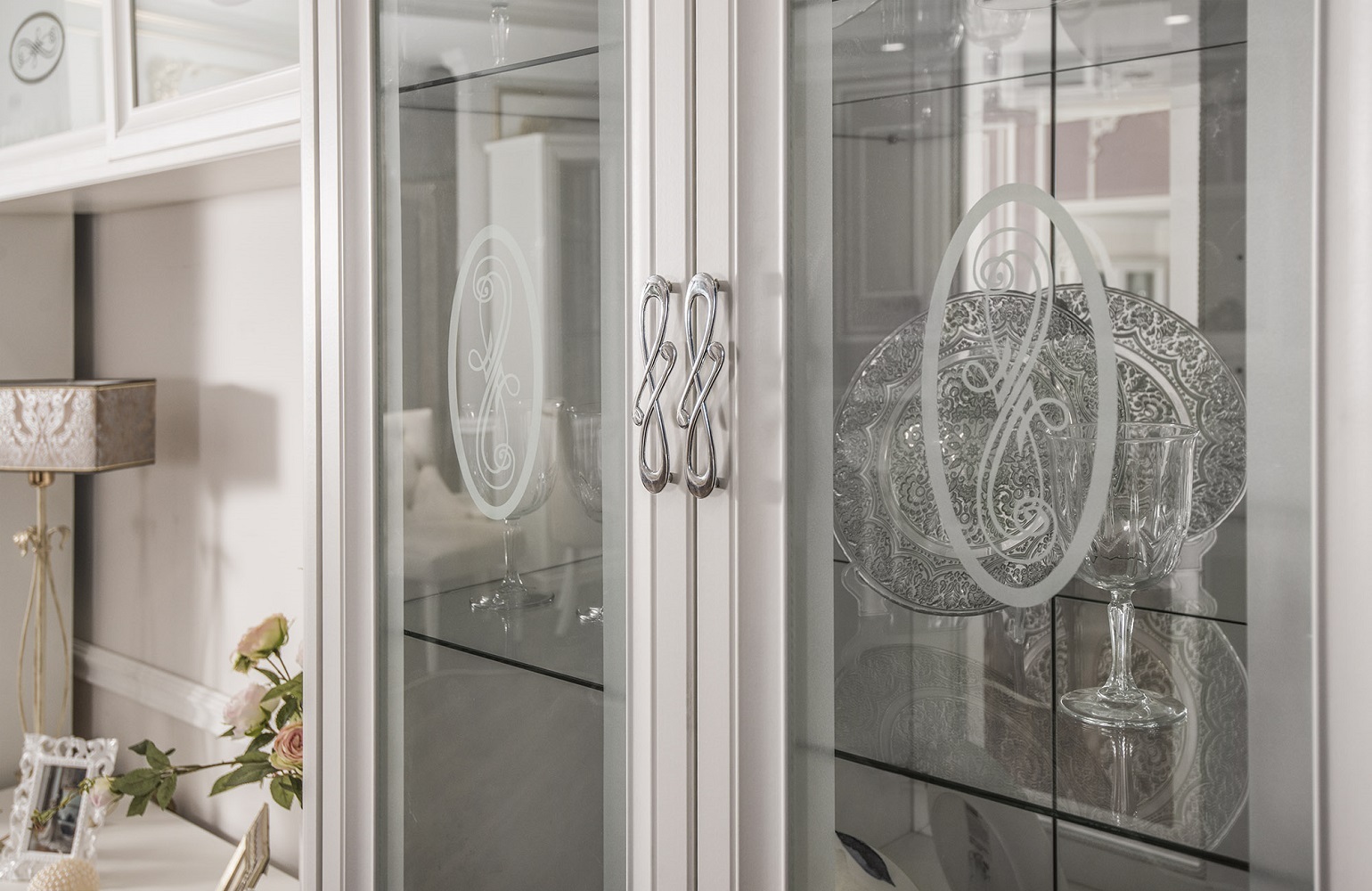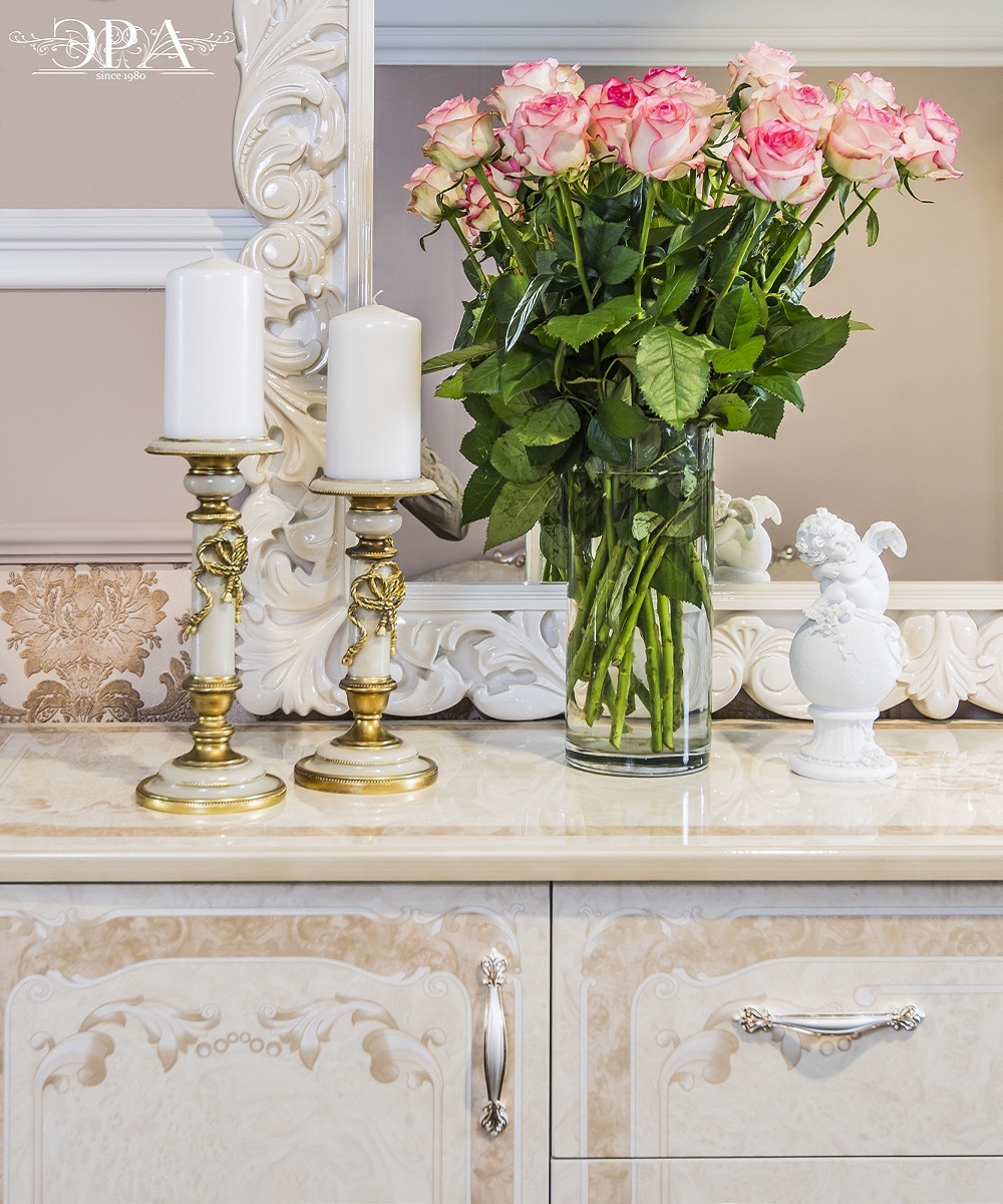 Коллекция сочетает в себе элегантность и практичность: фасады из фрезерованного МДФ с художественной росписью, прочный немецкий корпус и изысканные ручки Salice в форме браслета с итальянской глазурью.