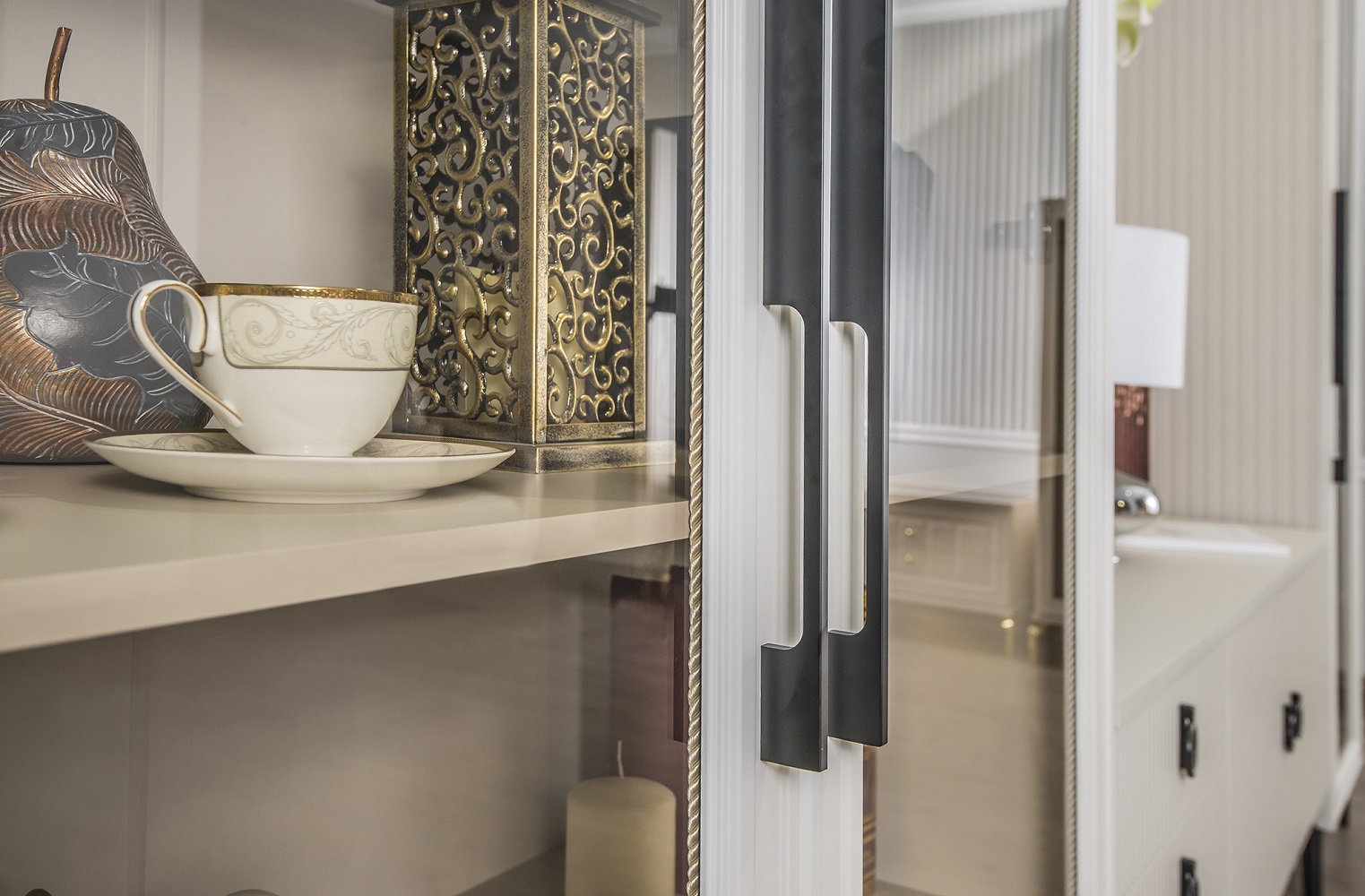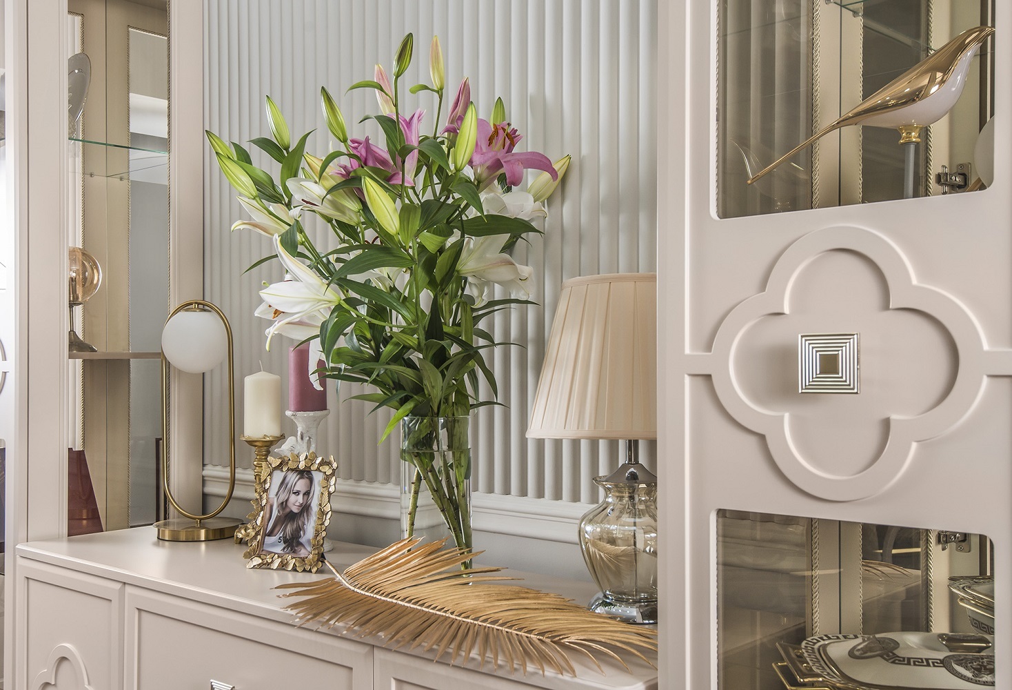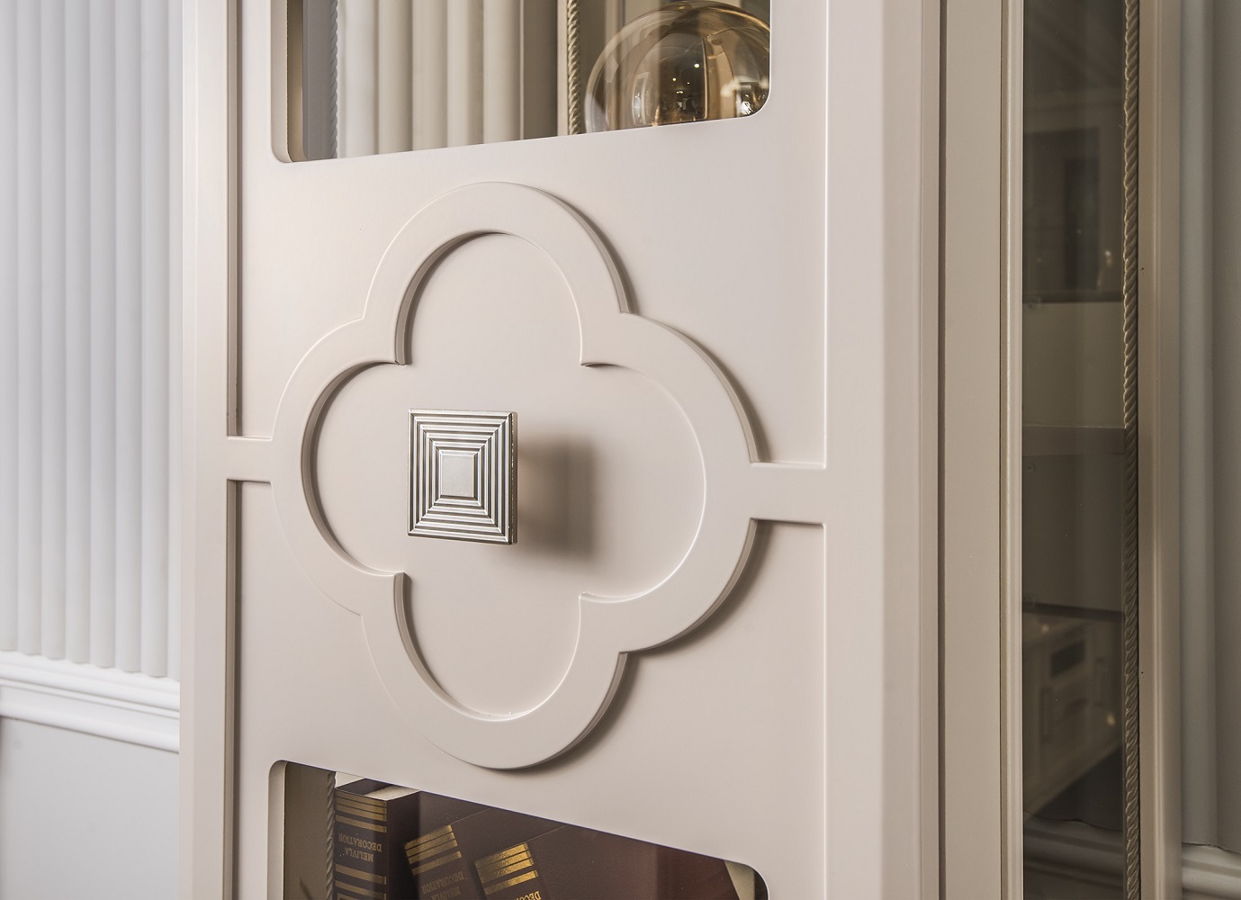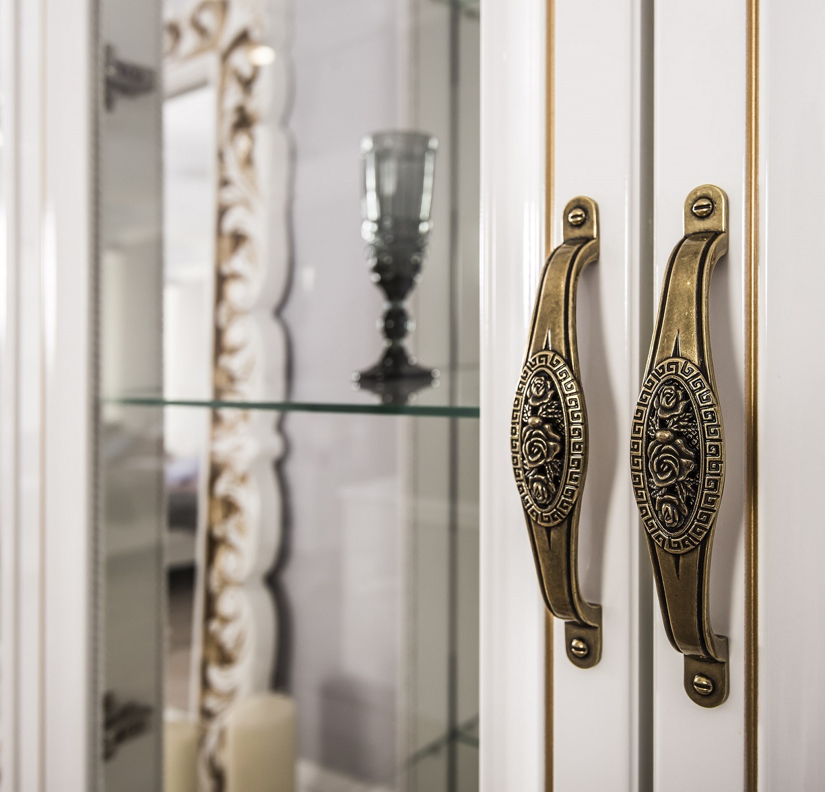 Коллекция сочетает в себе элегантность и практичность: фасады из фрезерованного МДФ с художественной росписью, прочный немецкий корпус и изысканные ручки Salice в форме браслета с итальянской глазурью.