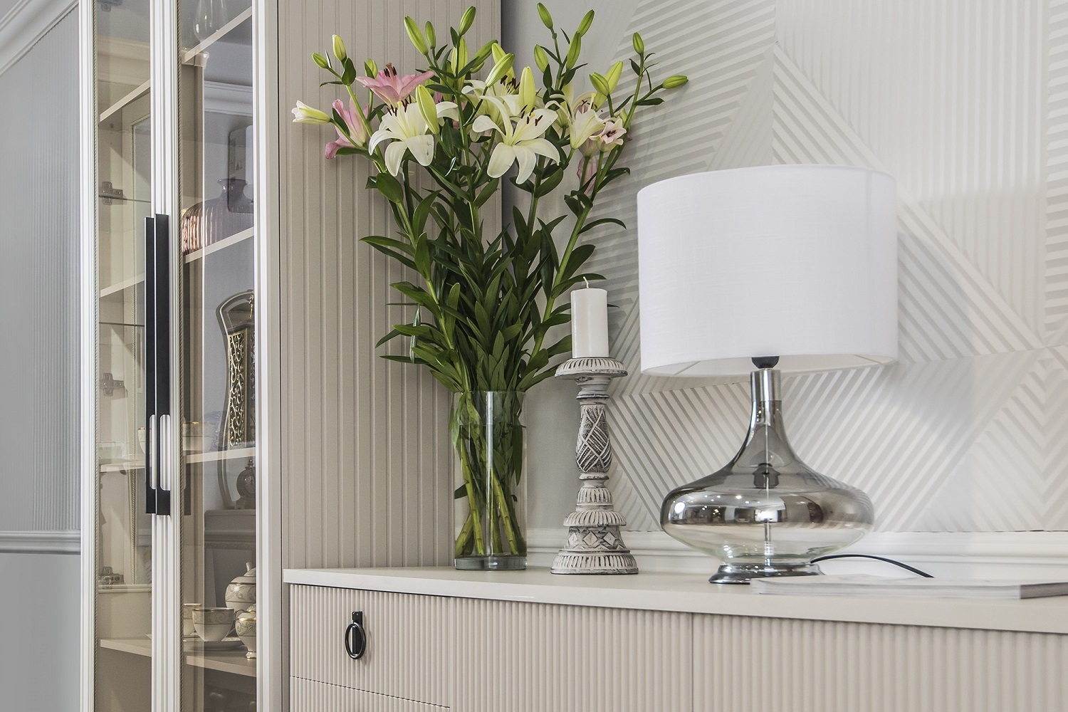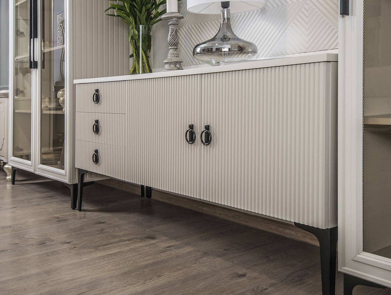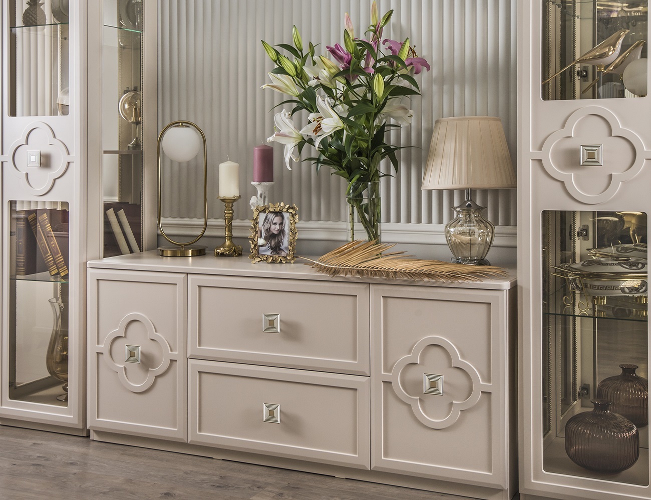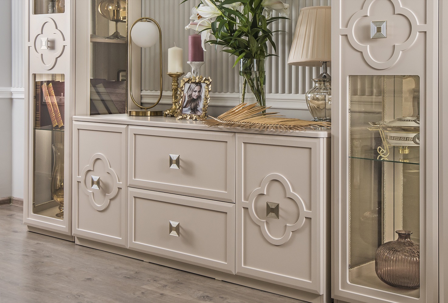 Функциональность здесь гармонично дополняет красоту: модули оснащены бесшумными доводчиками, регулируемыми опорами и продуманным наполнением – от панорамных витрин до удобных тумб и комодов.