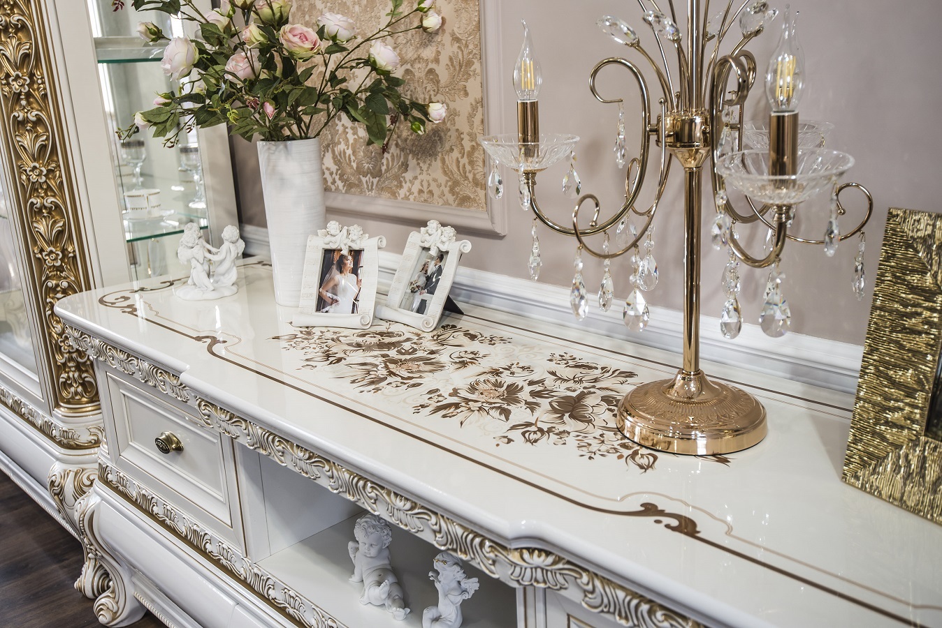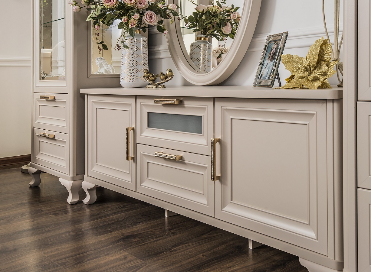 Гостиная "Натали" от фабрики ЭРА – это идеальное сочетание классической роскоши и современных технологий. Коллекция создана совместно с итальянскими дизайнерами и воплощает в себе утонченную эстетику: белоснежный глянец, золотая патина и изящные детали, такие как ручки с розой.