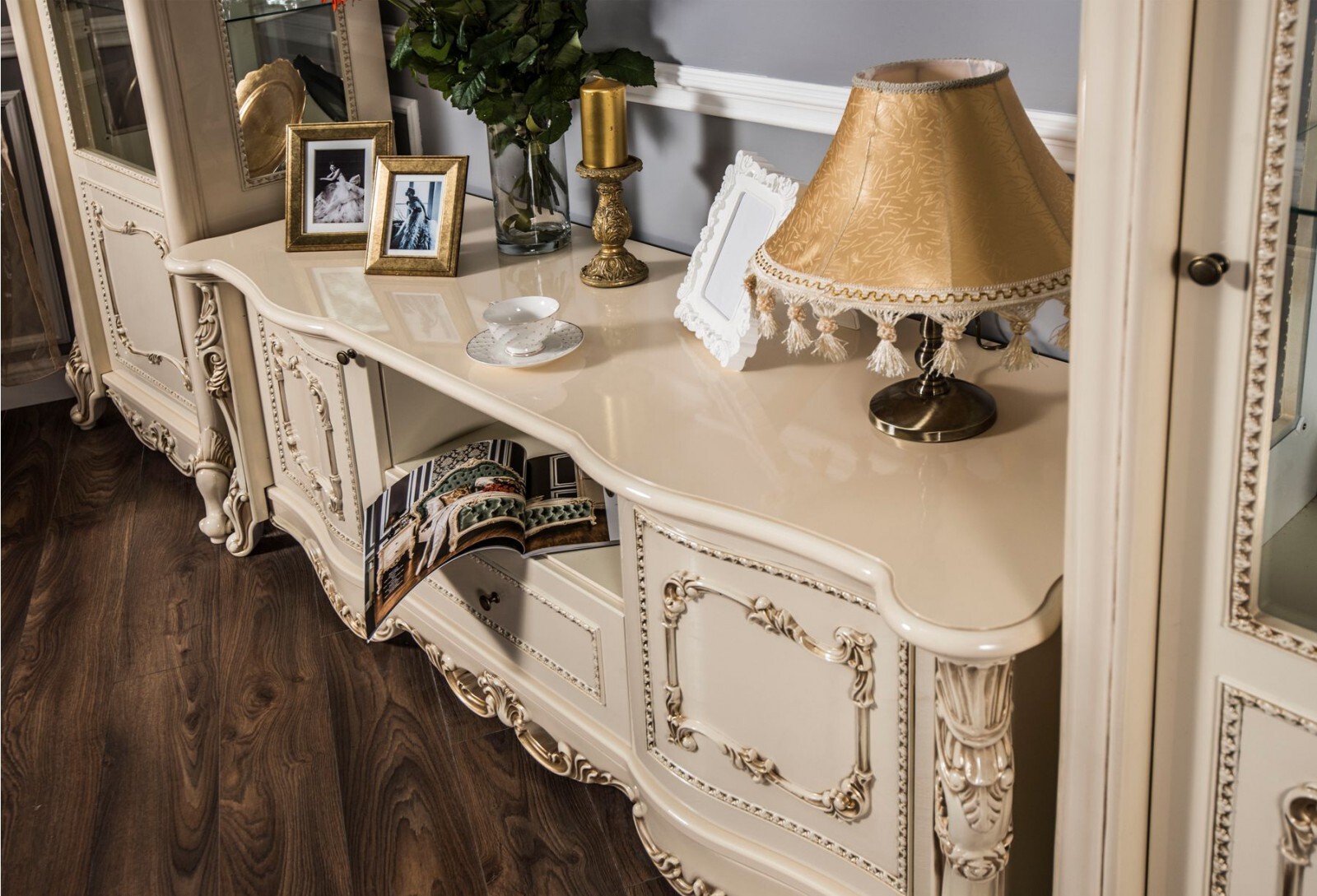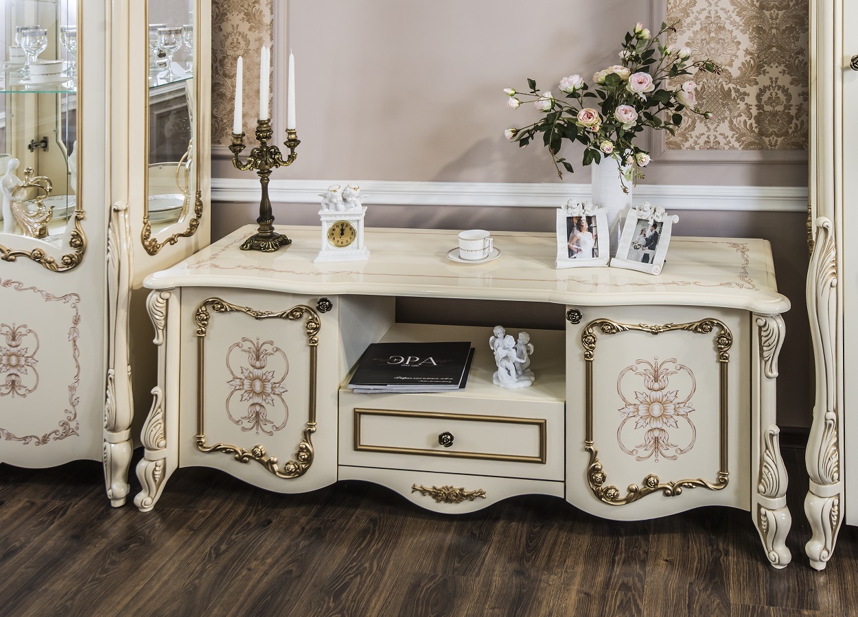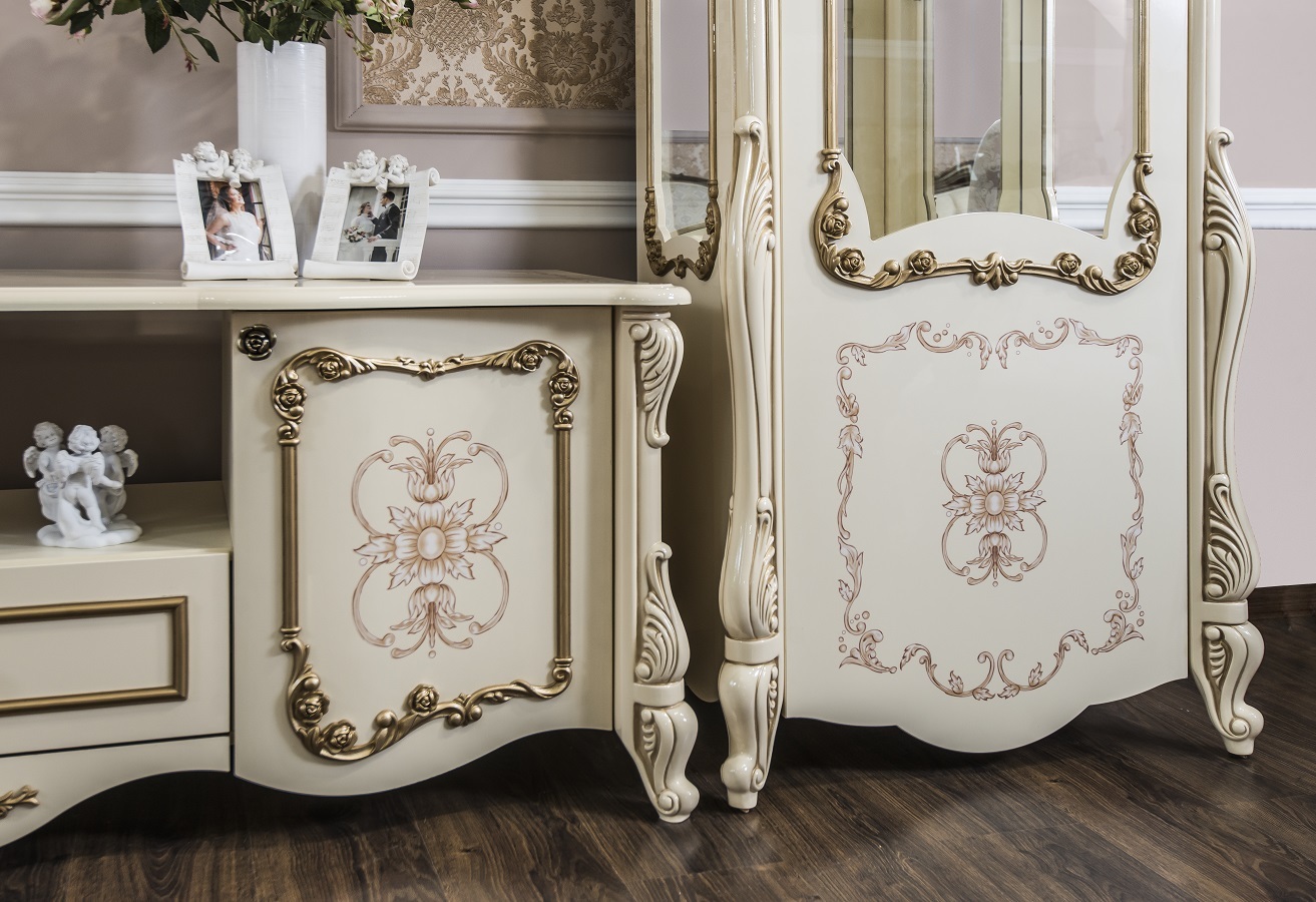 Гостиная «Алсу» – роскошь барокко в современном прочтении Коллекция «Алсу» – это искусное сочетание итальянского дизайна и русской душевности. Созданная при участии европейских мастеров, она воплощает всю пышность стиля барокко: изящные литые колонны, золотая патина ручной работы и филигранная резьба превращают каждый предмет в произведение искусства. Особенности коллекции: • Фасады с перламутровым эффектом и шелкографией • Роскошные декоративные элементы: пилястры, багеты и резные опоры • Практичная ТВ-группа с витринами для изысканного фарфора • Экологичные материалы итальянского качества «Алсу» – это не просто мебель, а семейная реликвия, которая будет радовать поколения. Современные технологии здесь гармонично сочетаются с вековыми традициями столярного мастерства. Выбирая «Алсу», вы выбираете вечную классику – ту самую, что создает атмосферу королевских приемов в вашей гостиной. Достойная альтернатива европейским брендам по доступной цене. Позвольте себе роскошь – с коллекцией «Алсу» это так просто!